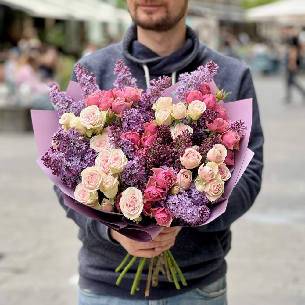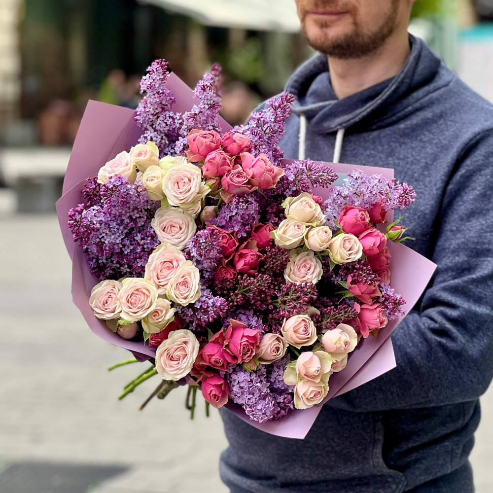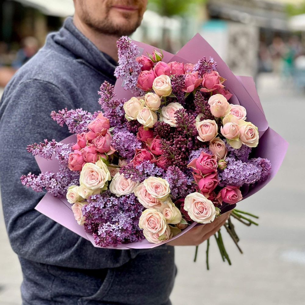 - Как заказать Душистый букет с сиренью и кустовой пионовидной розой «Ароматный май»? ❯