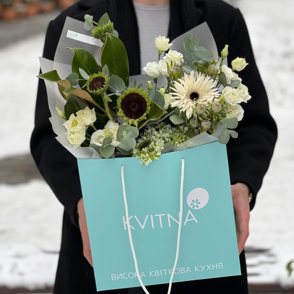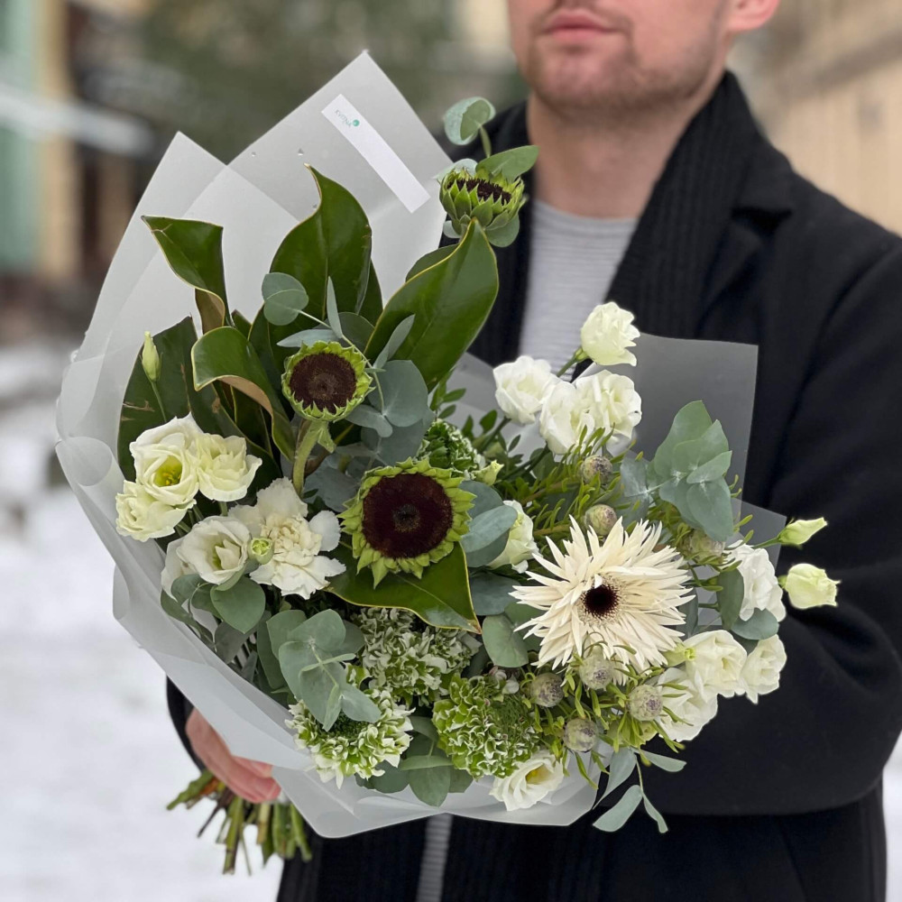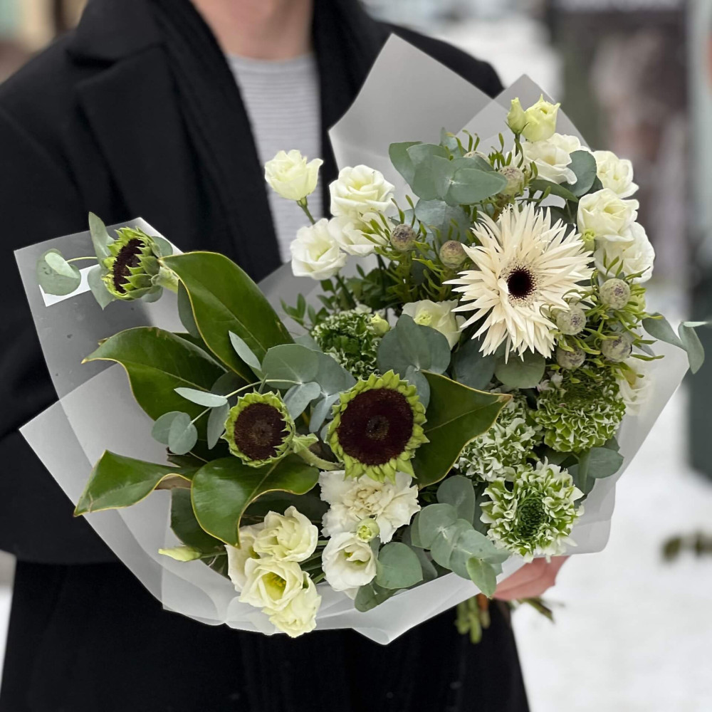 - Как заказать Бело-зелёный букет с ранункулюсами и подсолнухами «Заснеженный для Анны»? ❯