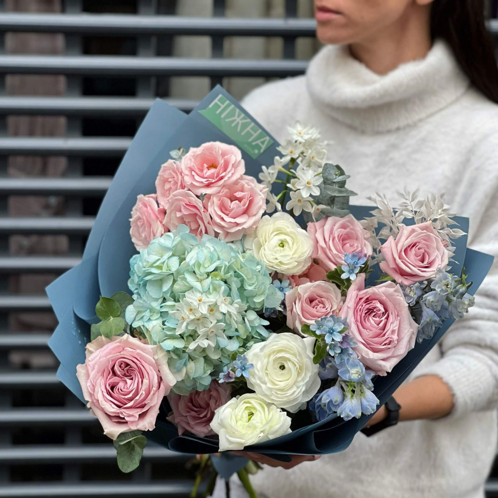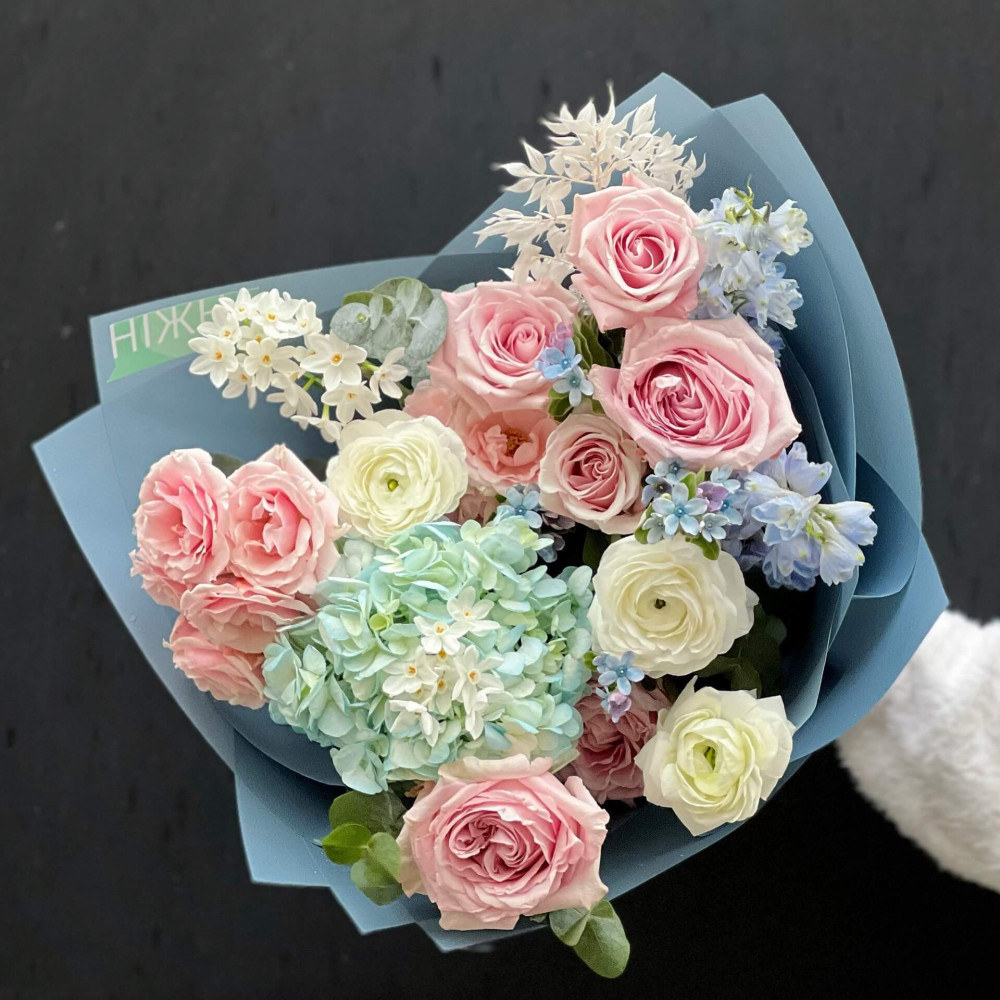Цветы: Гортензия, Роза кустовая, Ранунклюс, Нарцисс, Рускус, Оксипеталум, Дельфиниум, Эвкалипт