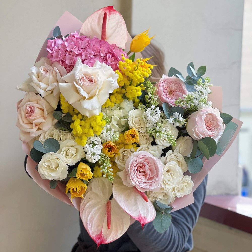 Цветы: Роза пионовидная, Гортензия, Антуриум, Сирень, Мимоза, Тюльпан, Эвкалипт