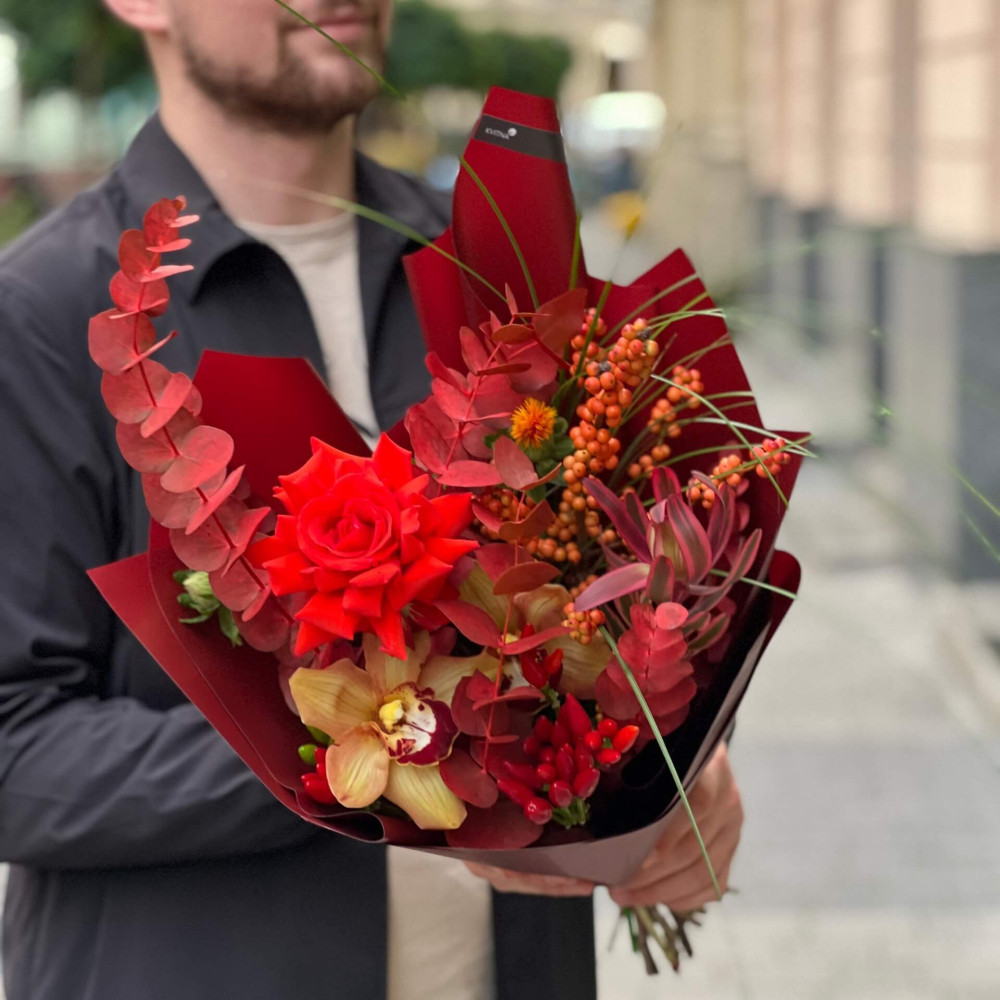 Цветы: Роза, Эвкалипт, Цимбидиум, Берграс, Илекс, Леукадендрон