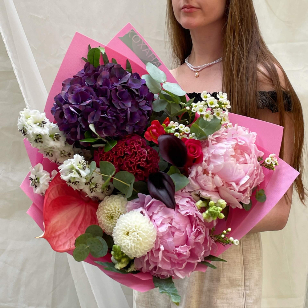 Цветы: Гортензия, Пион, Антуриум, Георгина, Дельфиниум, Хамелациум, Целозия, Зантедеския, Эвкалипт, Фрезия, Антирринум