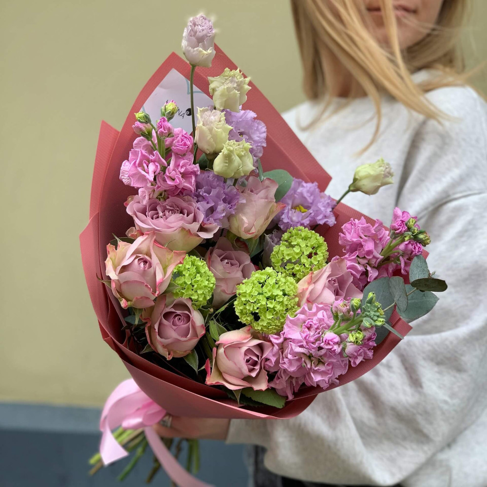 Цветы: Роза, Маттиола, Эустома, Вибурнум