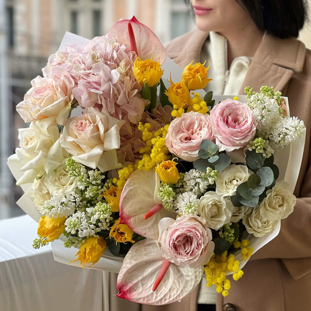 Цветы: Гортензия, Роза пионовидная, Антуриум, Сирень, Мимоза, Тюльпан