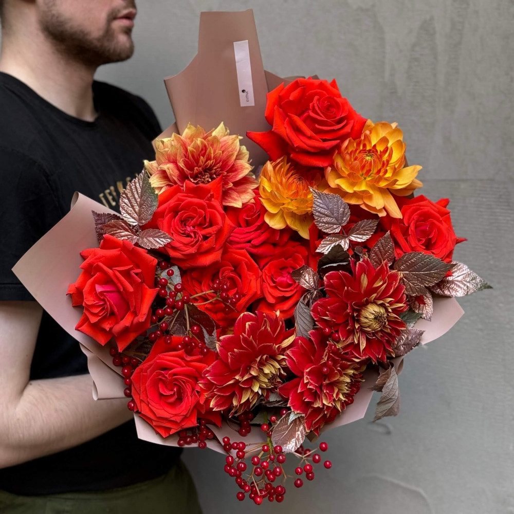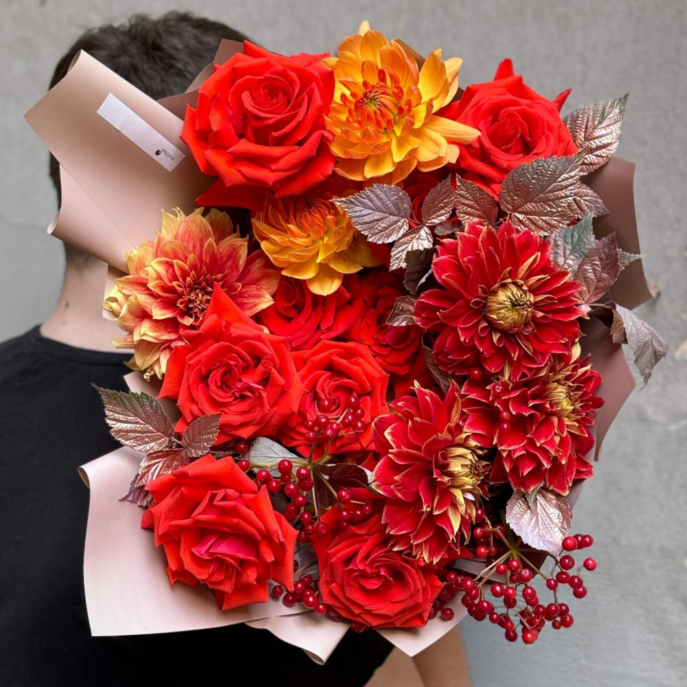 Цветы: Вибурнум (ягоды), Георгина, Малина (листья), Роза Nina