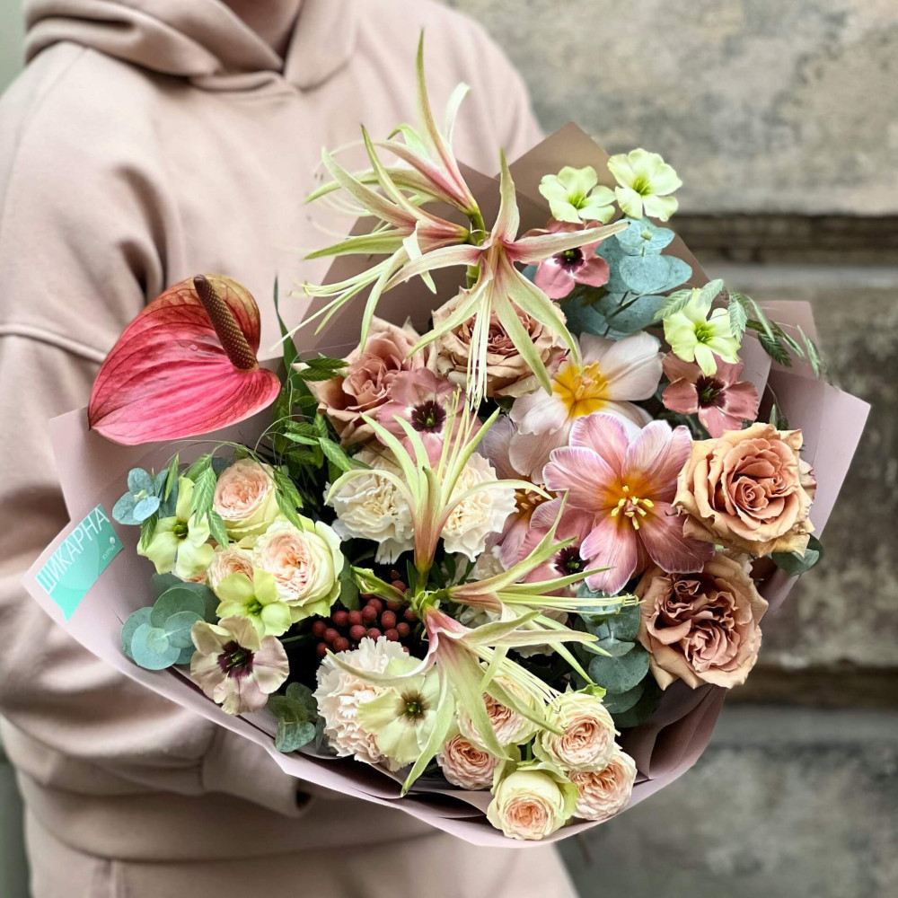Цветы: Роза пионовидная, Гипеаструм, Антуриум, Эвкалипт, Эустома, Тюльпан
