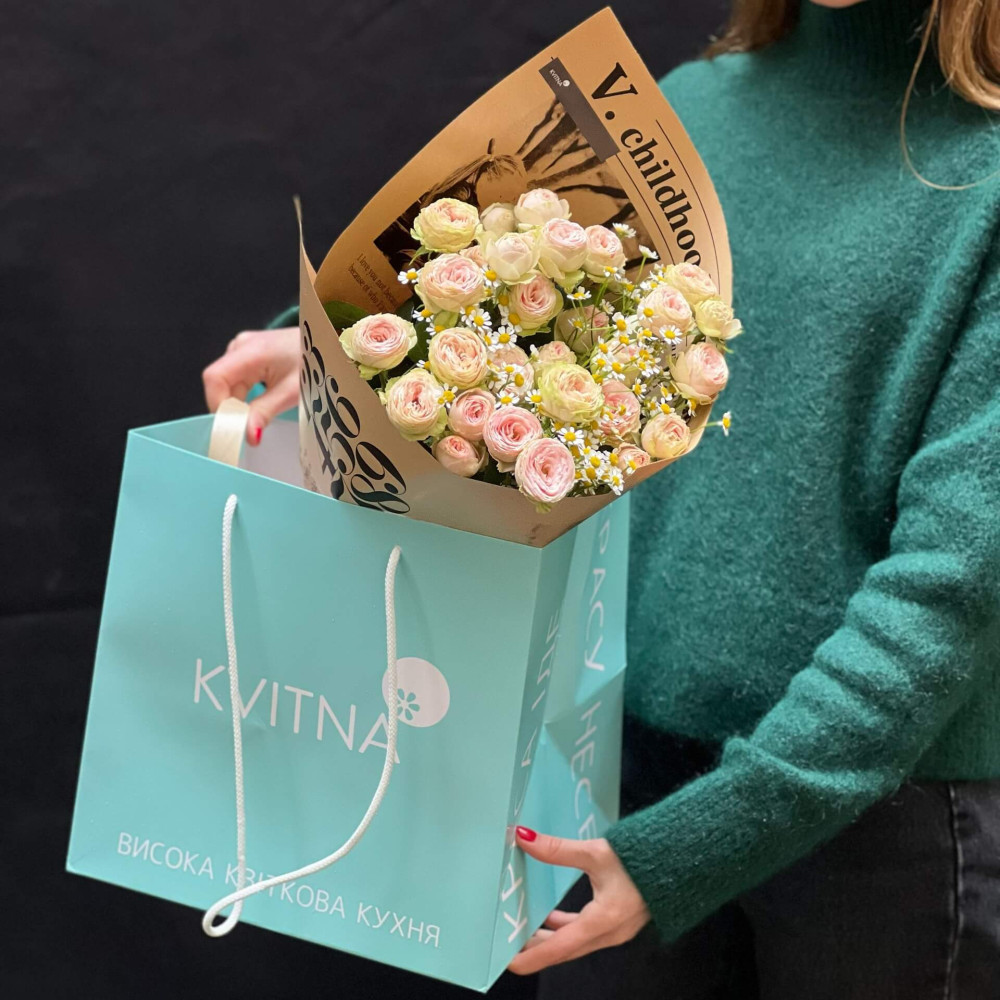 - Букеты от Kvitna доставляются в фирменной упаковке, которую нужно снять при установке цветов в вазу. Не срезайте ленту, связывающую букет, чтобы сохранить форму.