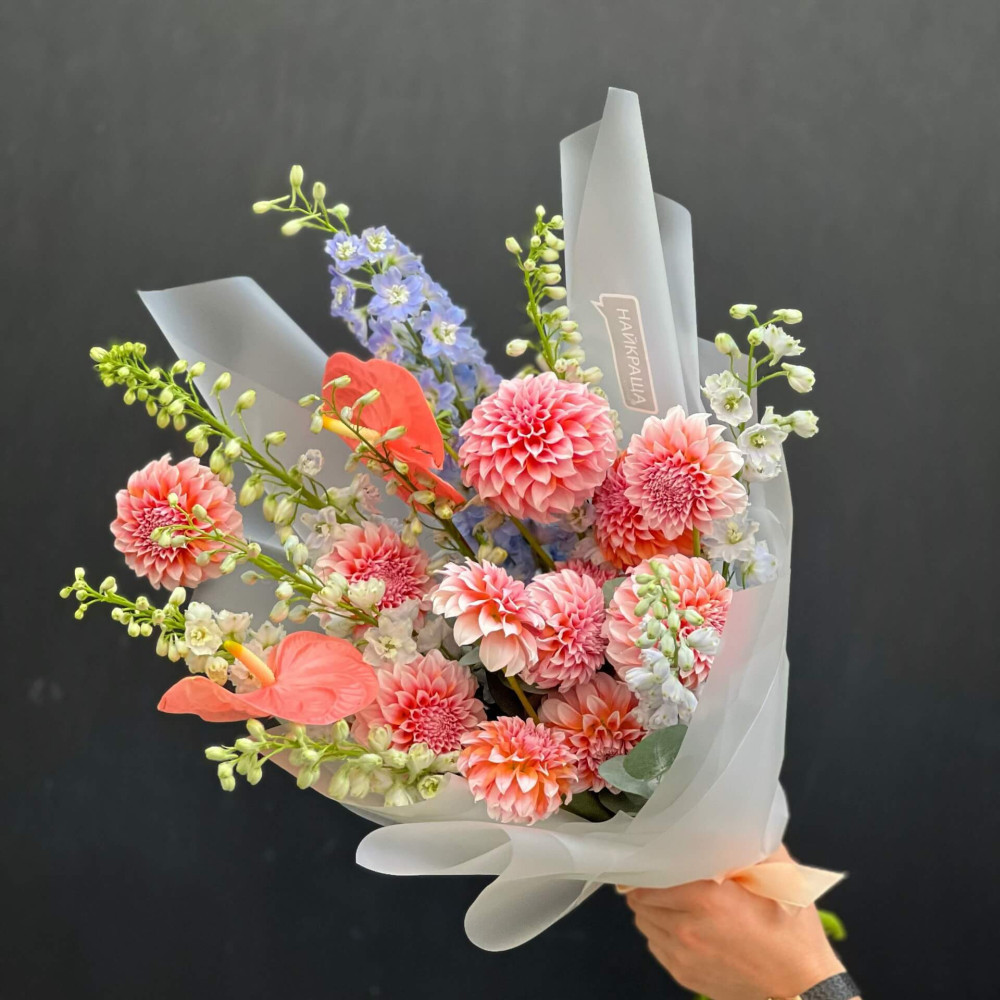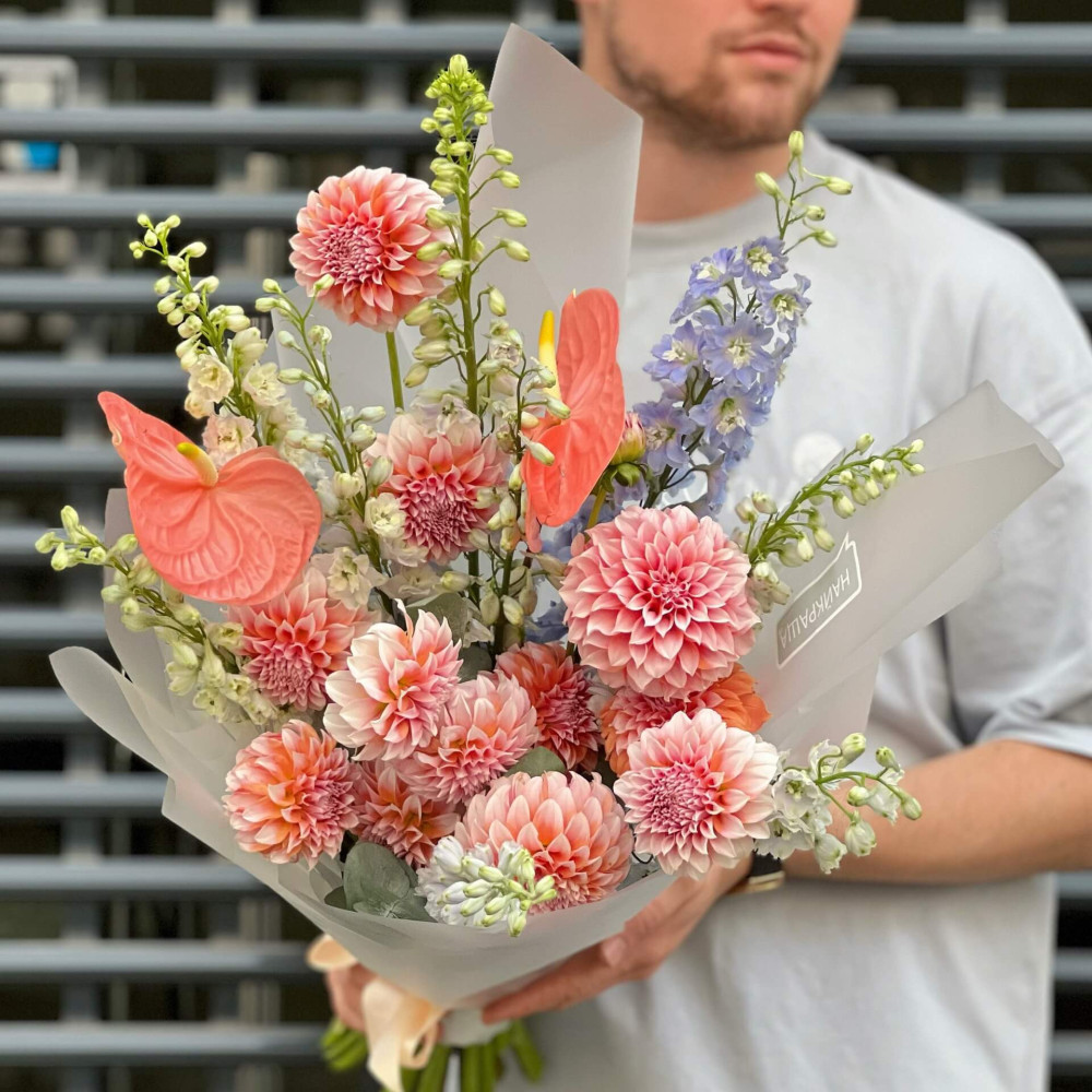 Цветы: Георгина, Дельфиниум, Антуриум, Эвкалипт