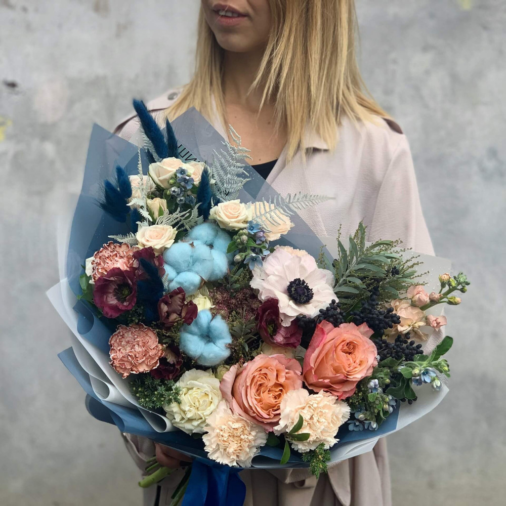 Цветы: Роза, Роза пионовидная, Анемон, Амми, Эустома, Мимоза, Диантус (Гвоздика), Маттиола, Хлопок, Лагурус
