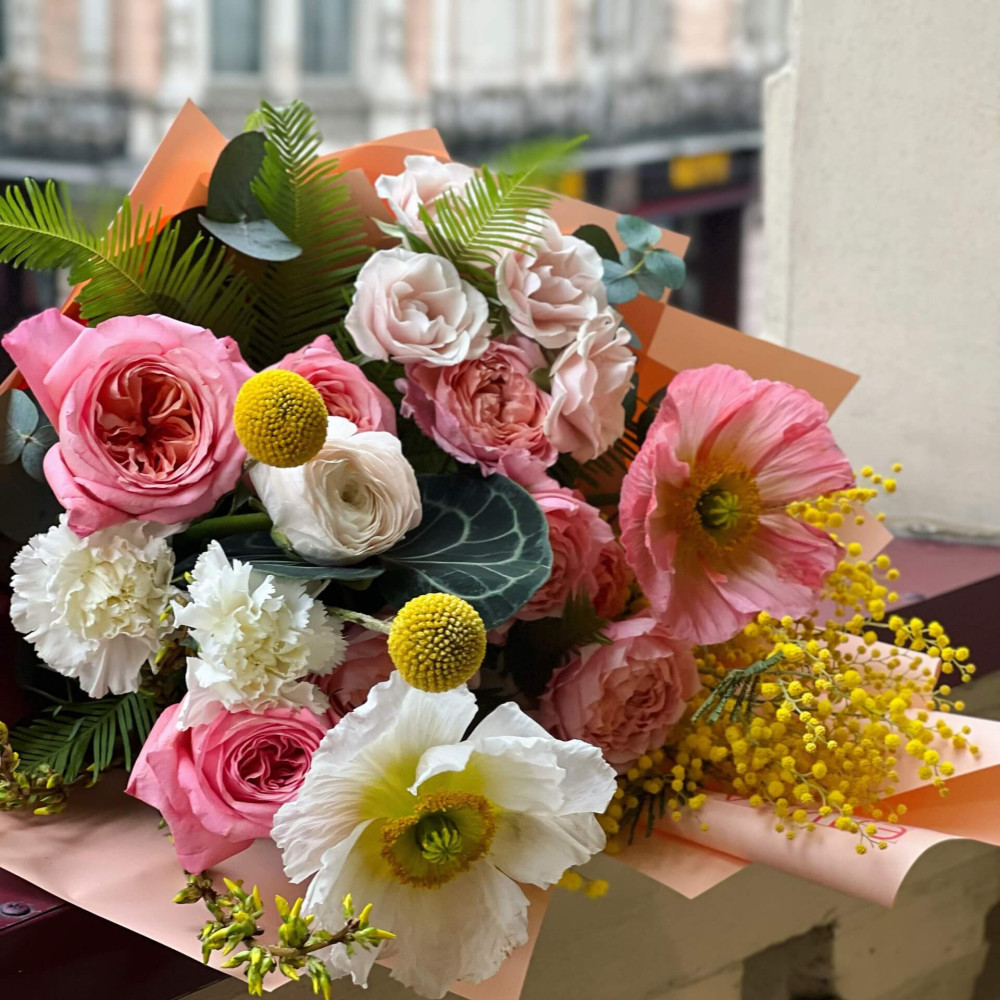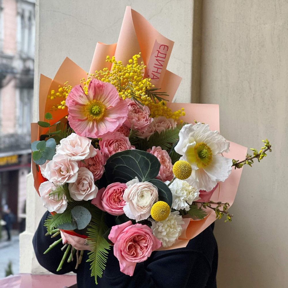 Цветы: Роза кустовая, Папавер (Мак), Мимоза, Краспедия, Роза пионовидная, Антуриум, Диантус