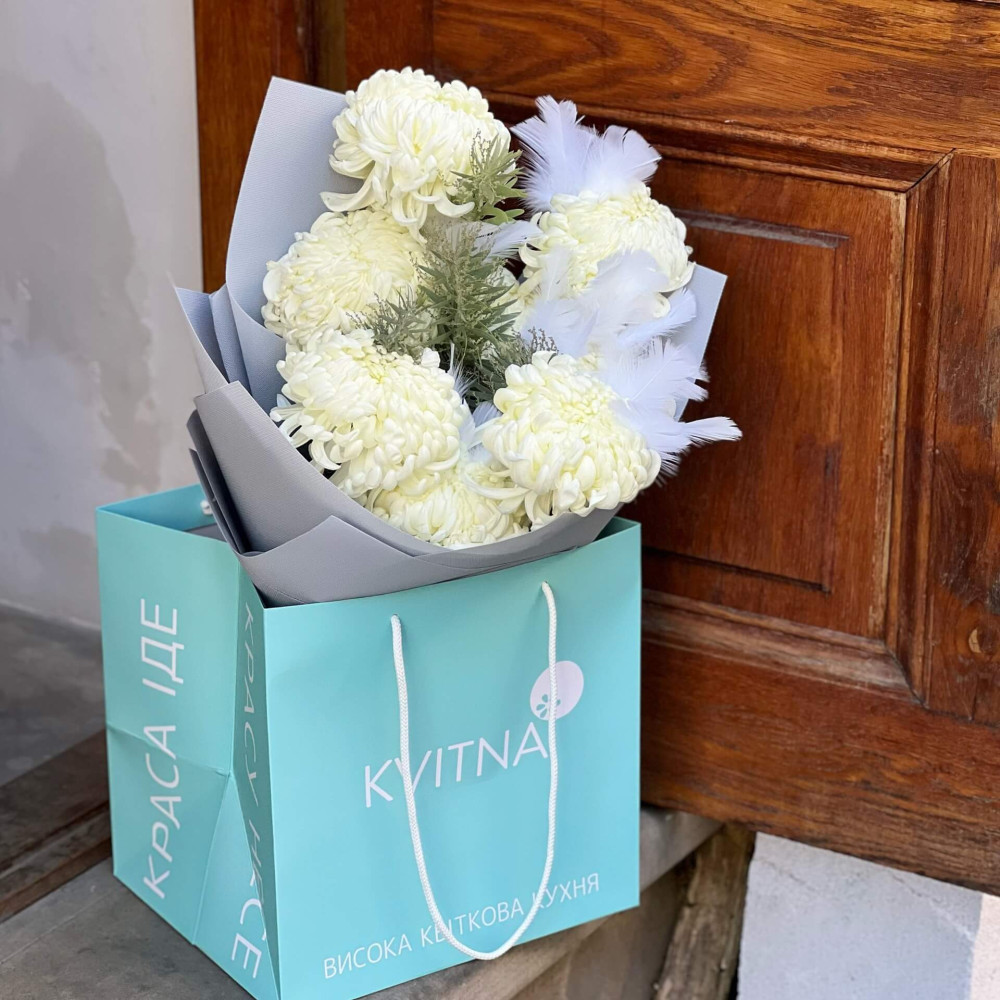 - Букеты от Kvitna доставляются в фирменной упаковке, которую нужно снять при установке цветов в вазу. Не срезайте ленту, связывающую букет, чтобы сохранить форму.