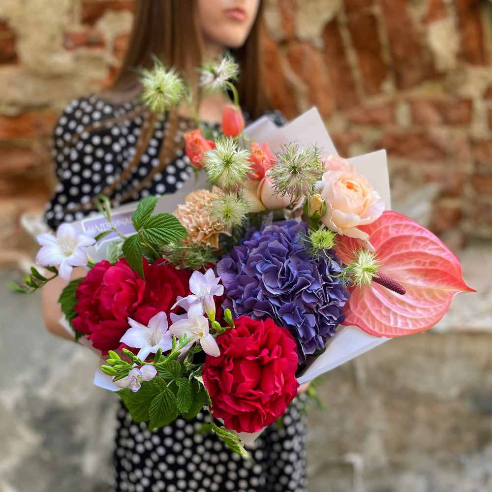 Цветы: Пион, Гортензия, Фрезия, Антуриум, Нигелла, Тюльпан, Роза, Диантус