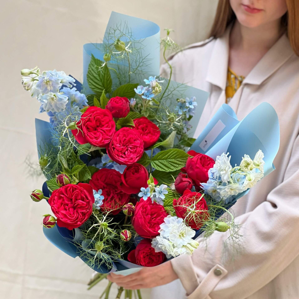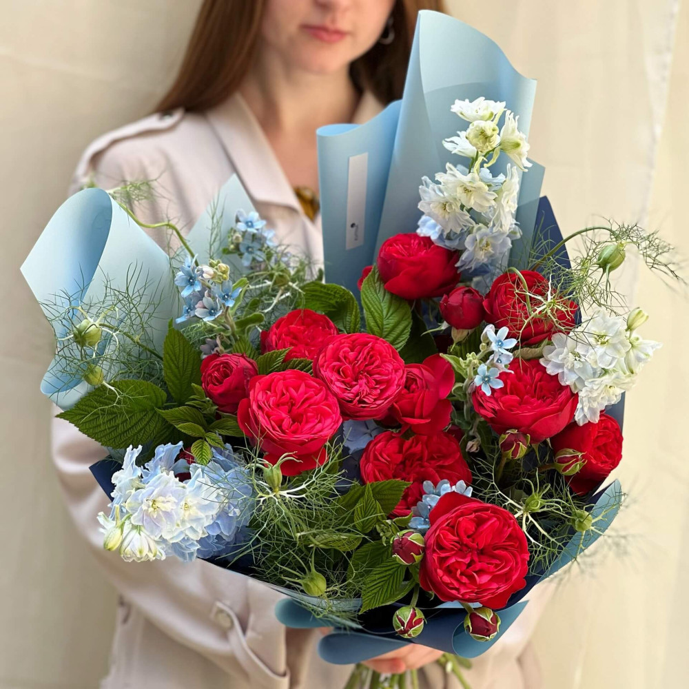 Цветы: Роза пионовидная, Гортензия, Дельфиниум, Оксипеталум, Малина