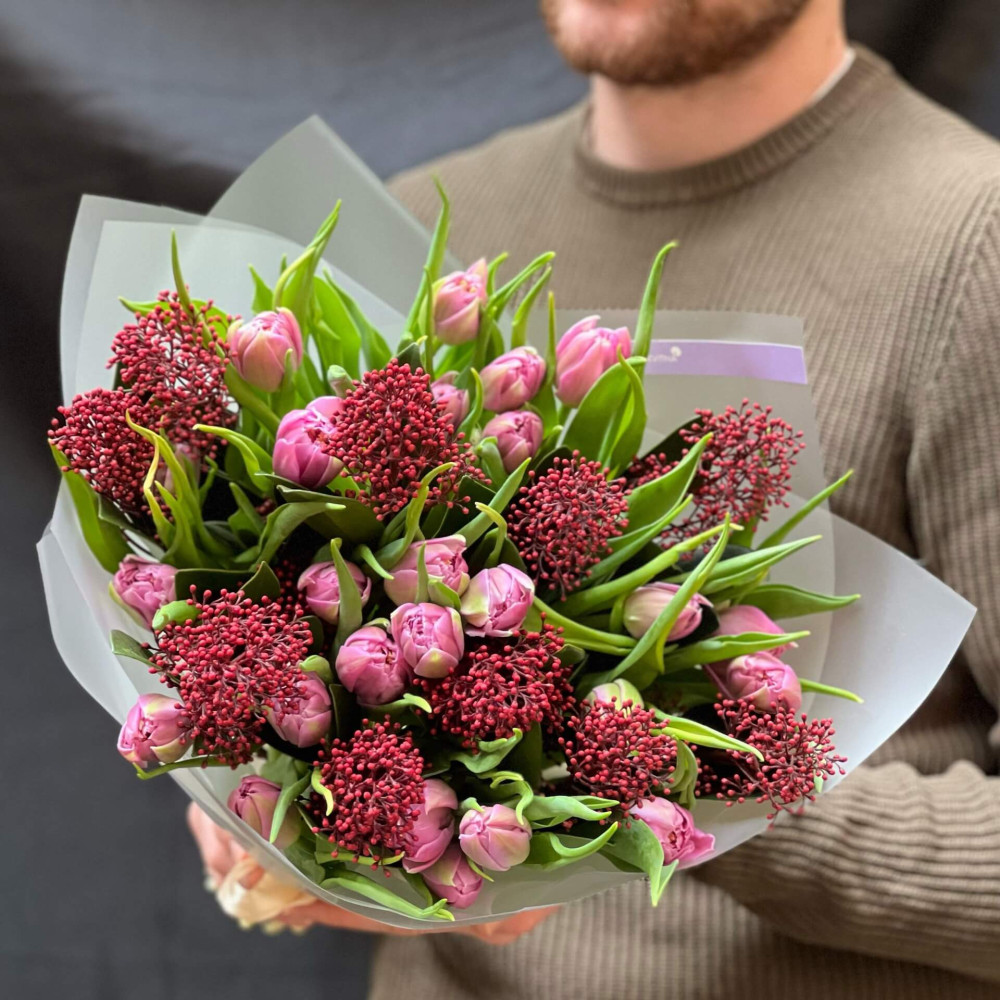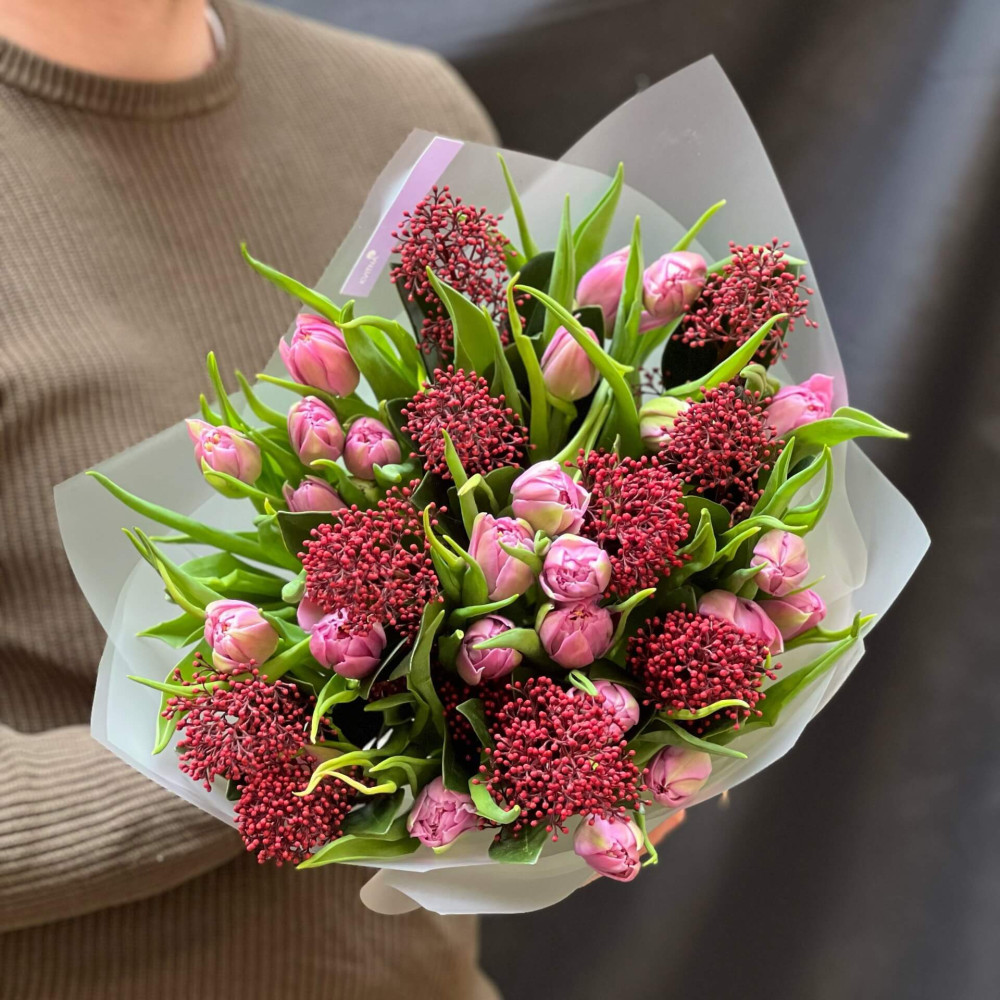 - Как заказать 25 тюльпанов и скиммия в букете «Взгляд Катерины»? ❯