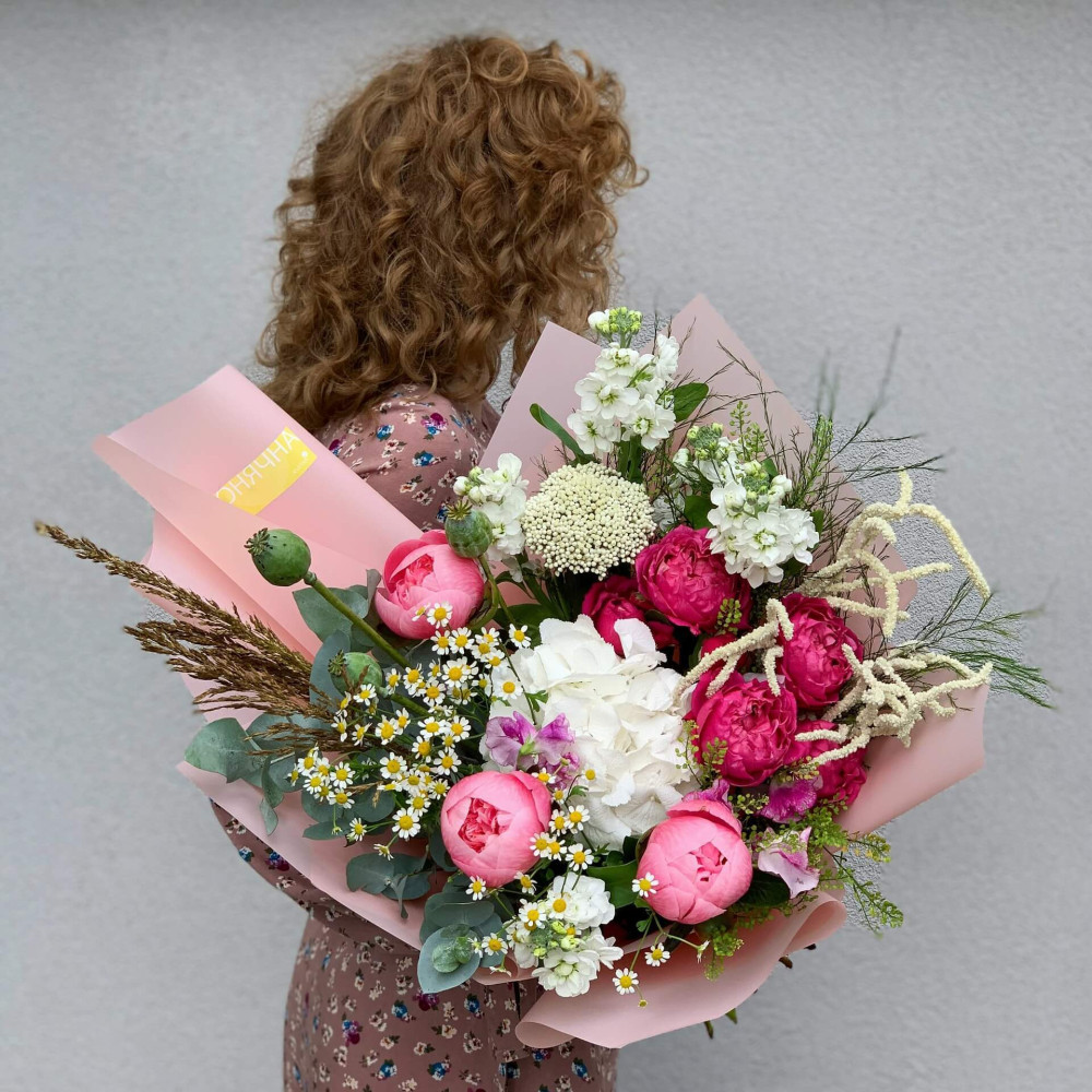 Цветы: Гортензия, Роза пионовидная, Амарант, Маттиола, Танацетум, Папавер (Мак), Эвкалипт, Аспарагус, Пион