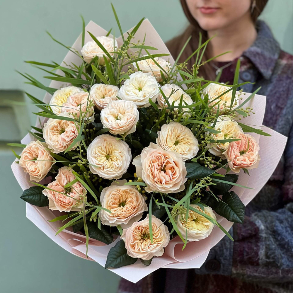 Пионовидные розы в сезоне круглый год, поэтому букеты будут без замен, или замены будут минимальными.