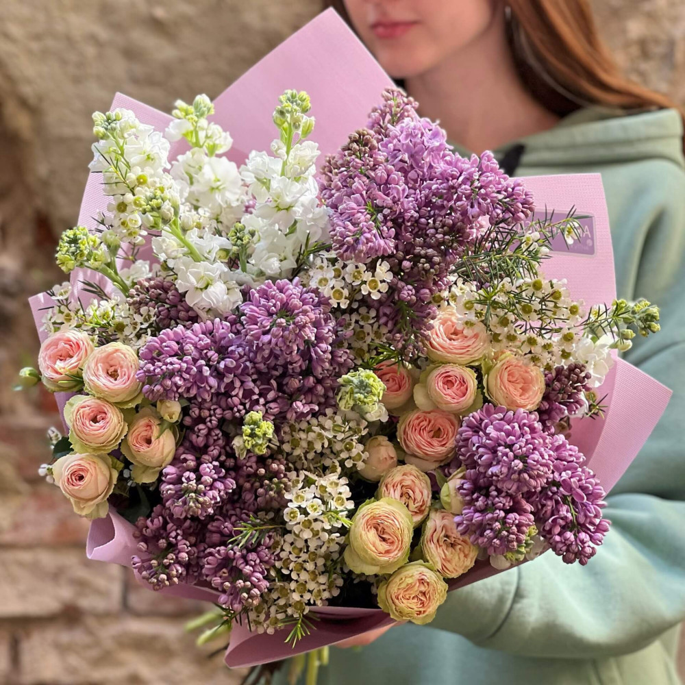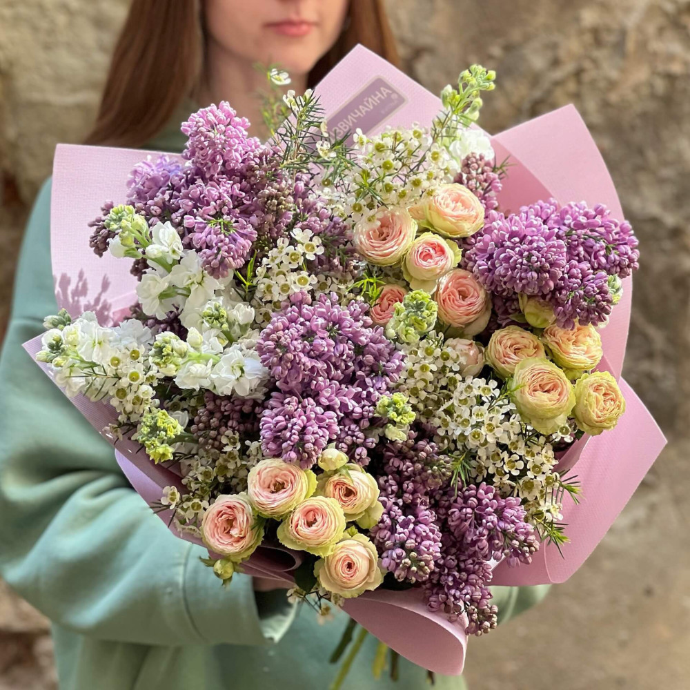 Цветы: Сирень, Роза кустовая, Хамелациум, Маттиола