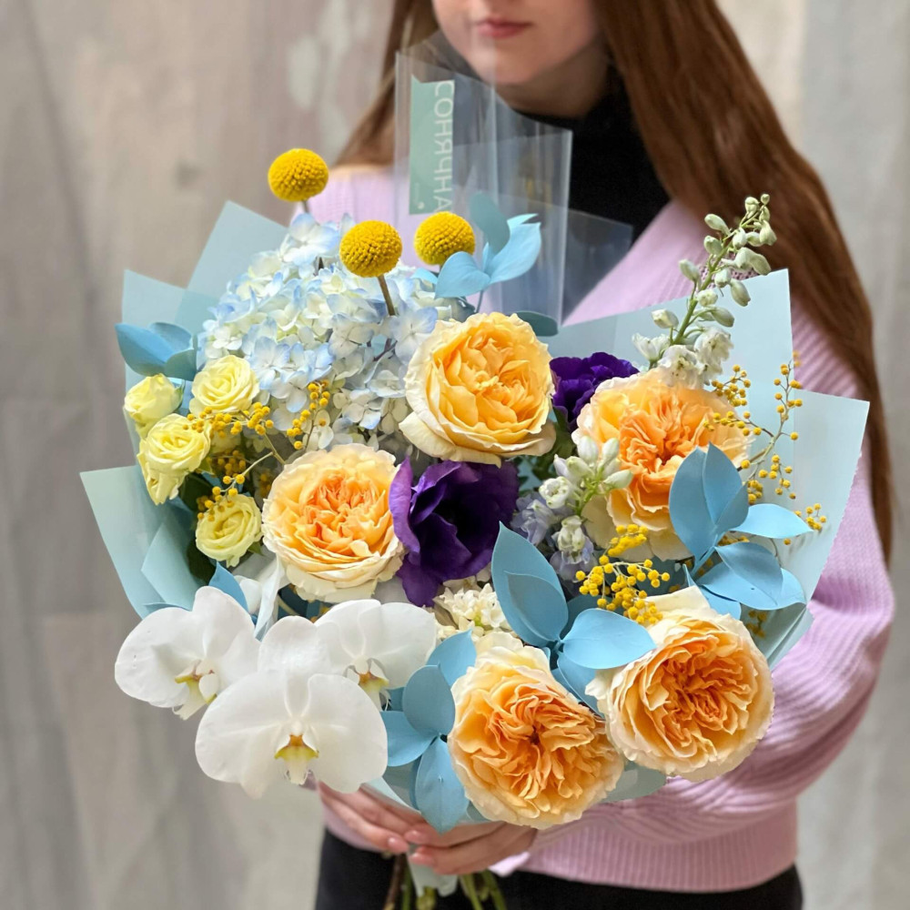 Цветы: Роза пионовидная, Анемон, Фаленопсис, Гортензия, Краспедия, Мимоза, Дельфиниум