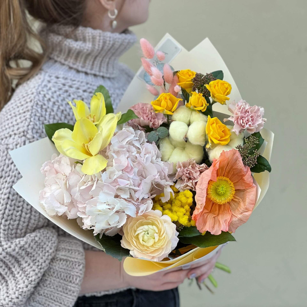 Цветы: Гортензия, Папавер (Мак), Хлопок, Роза кустовая, Тюльпан, Ранунклюс, Мимоза