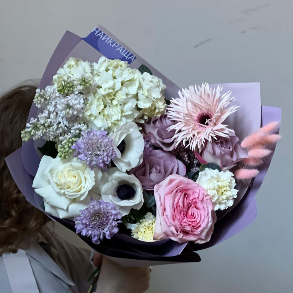 Цветы: Гортензия, Гербера, Роза, Анемон, Скабиоза, Сирень, Эвкалипт, Диантус, Лагурус