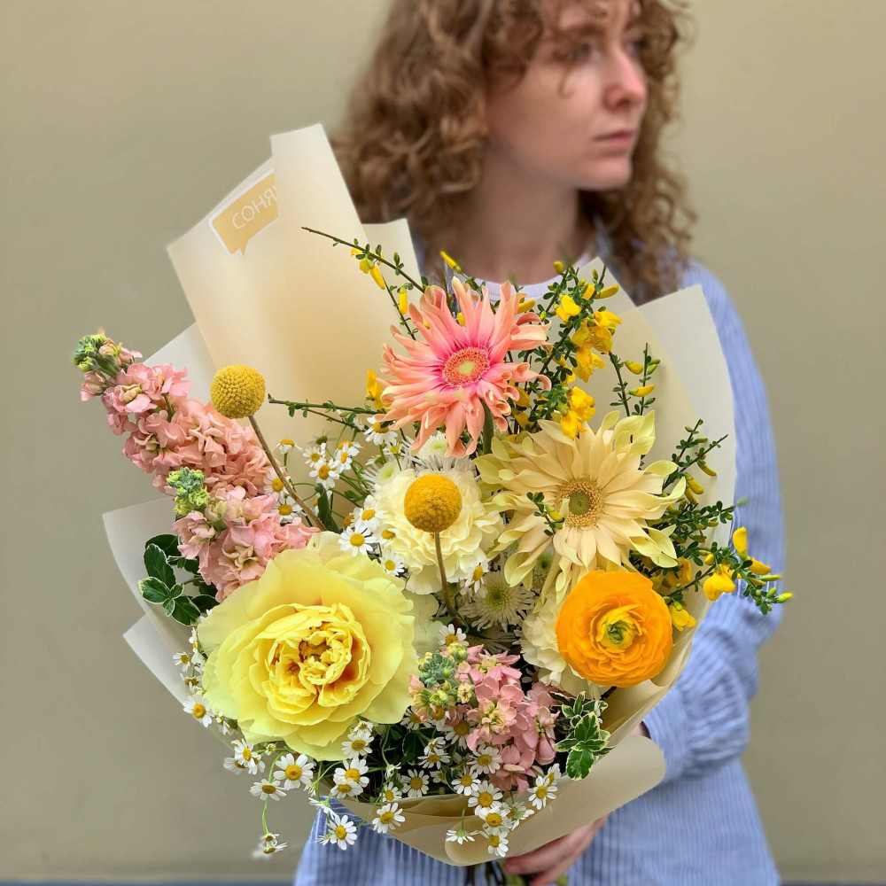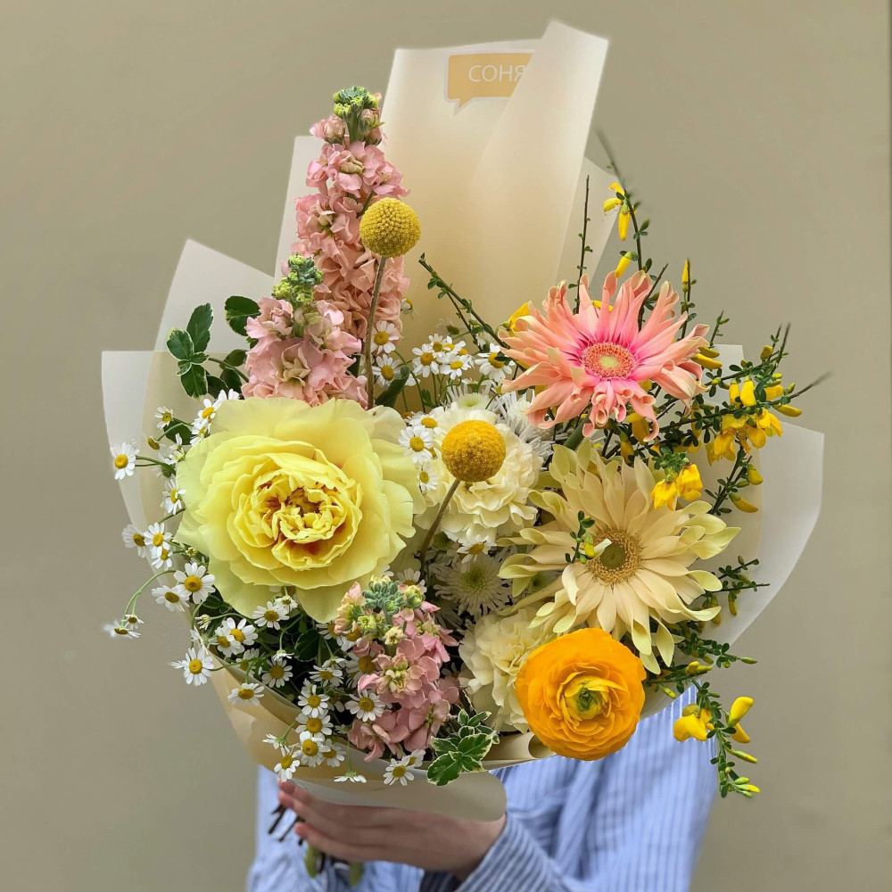 Цветы: Пион, Маттиола, Гербера, Краспедия, Ранунклюс, Танацетум, Гениста, Хризантема