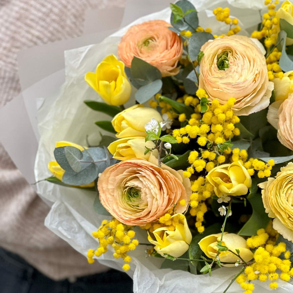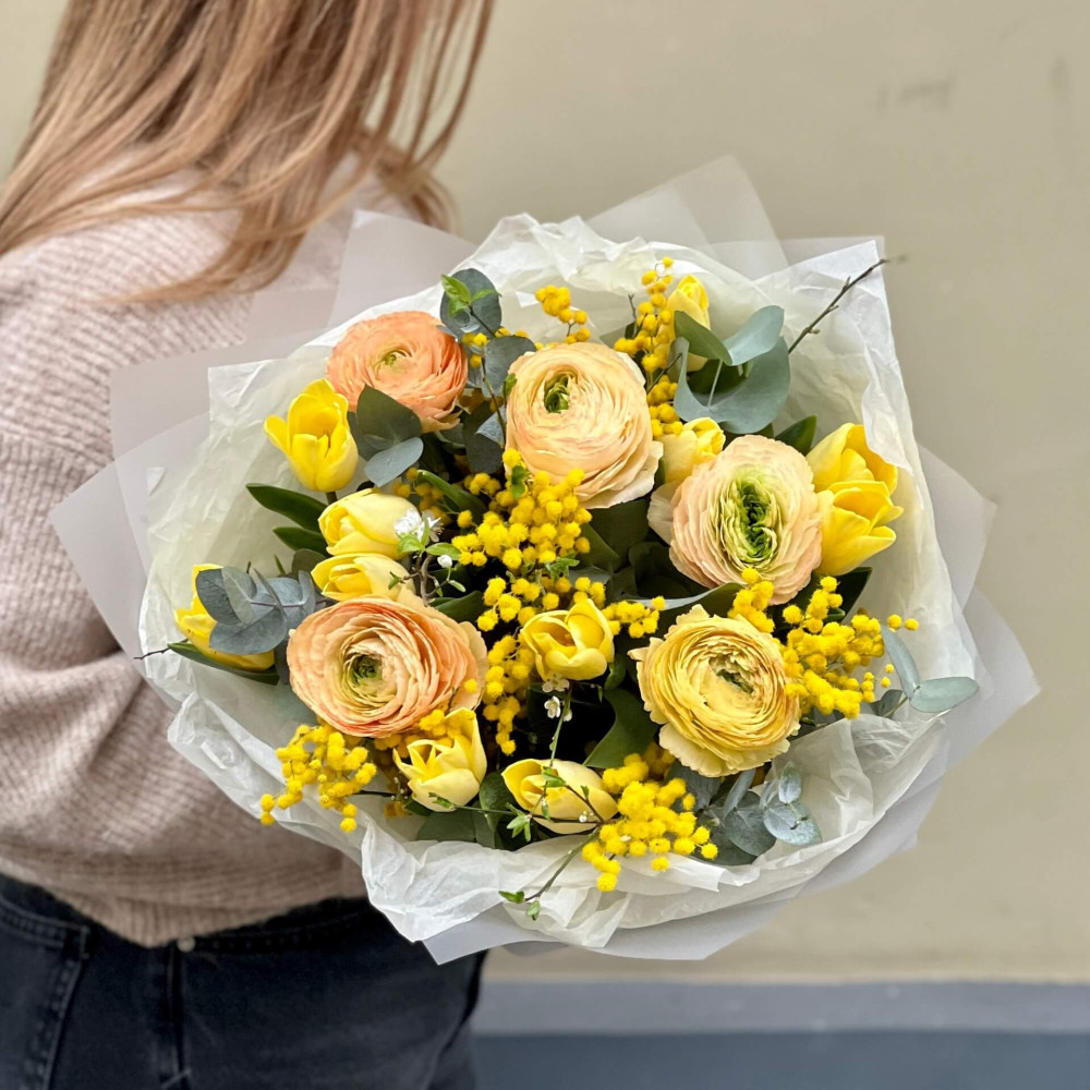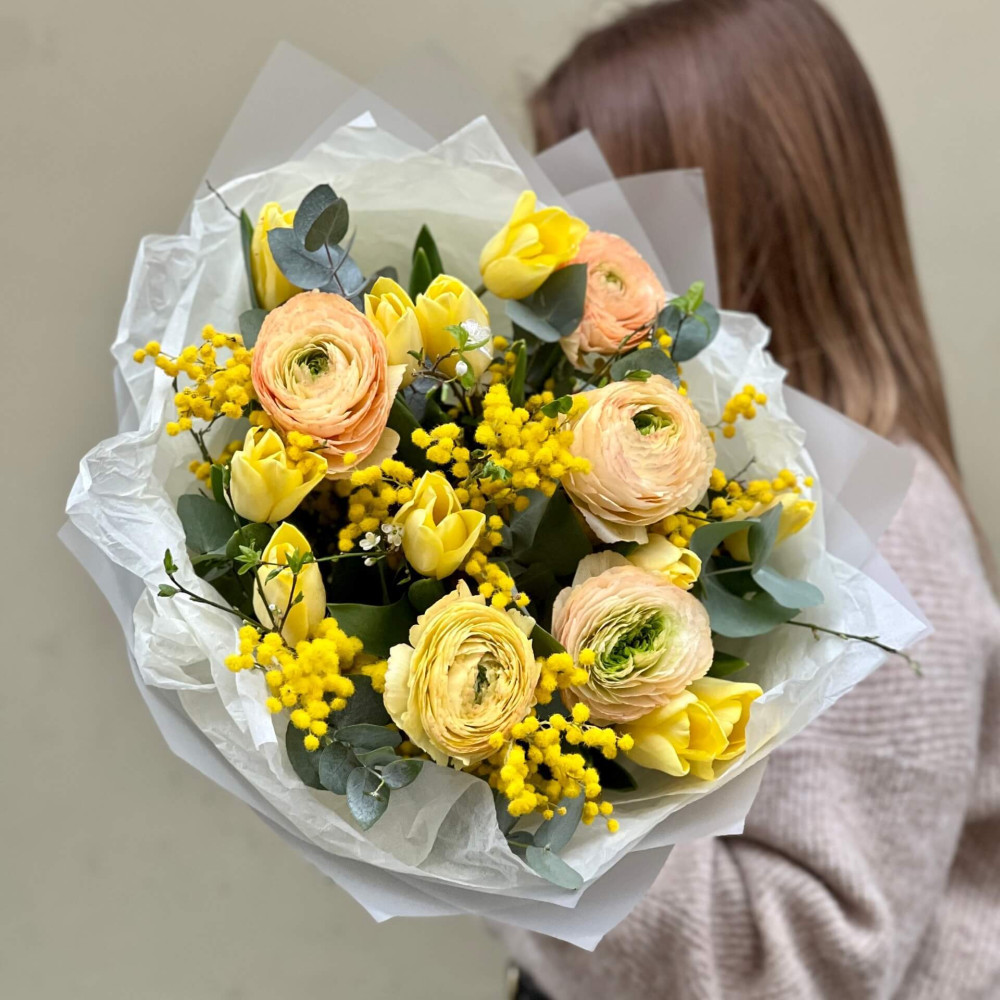 Цветы: Ранунклюс, Мимоза, Тюльпан, Эвкалипт