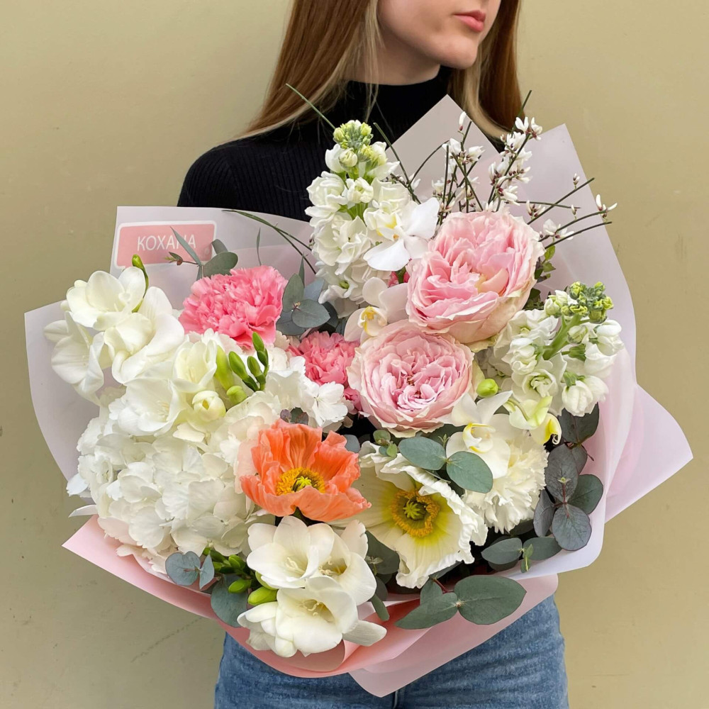 Цветы: Роза пионовидная, Гортензия, Папавер (Мак), Гениста, Эвкалипт, Фрезия, Маттиола, Диантус