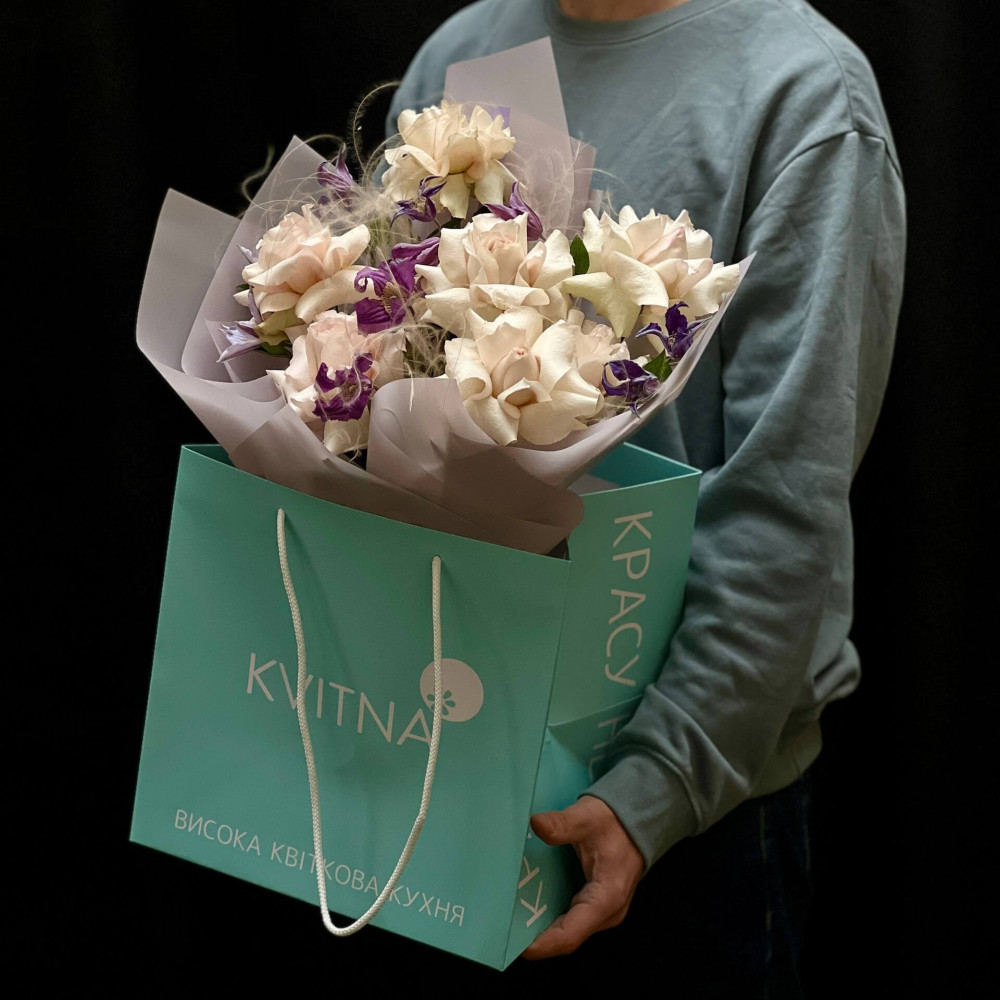- Букеты от Kvitna доставляются в фирменной упаковке, которую нужно снять при установке цветов в вазу. Не срезайте ленту, связывающую букет, чтобы сохранить форму.