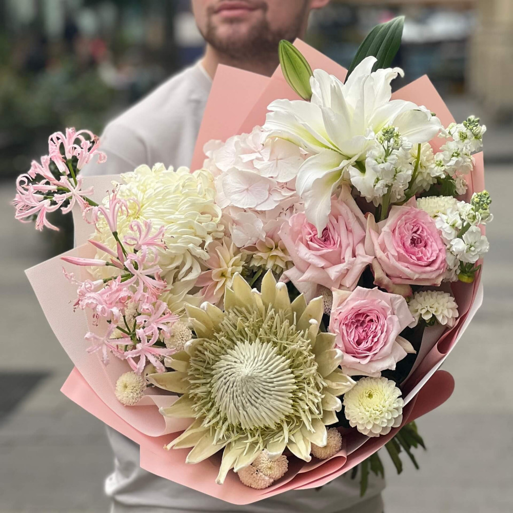 Цветы: Нерине, Протея, Георгина, Гортензия, Роза пионовидная, Хризантема, Лилия