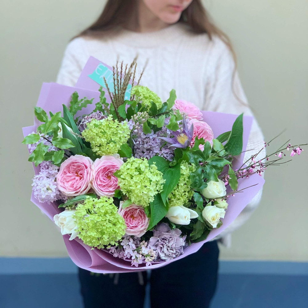 Цветы: Вибурнум, Сирень, Роза пионовидная, Тюльпан, Питтоспорум, Гениста