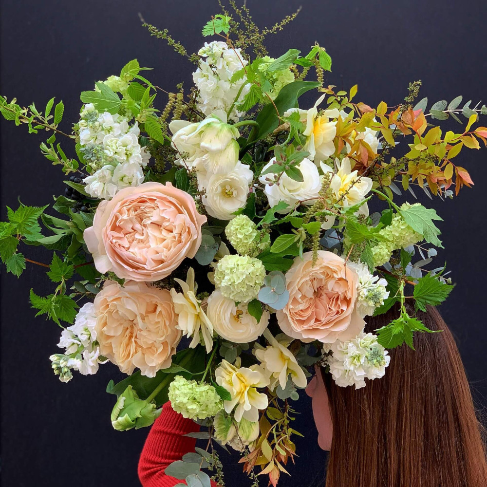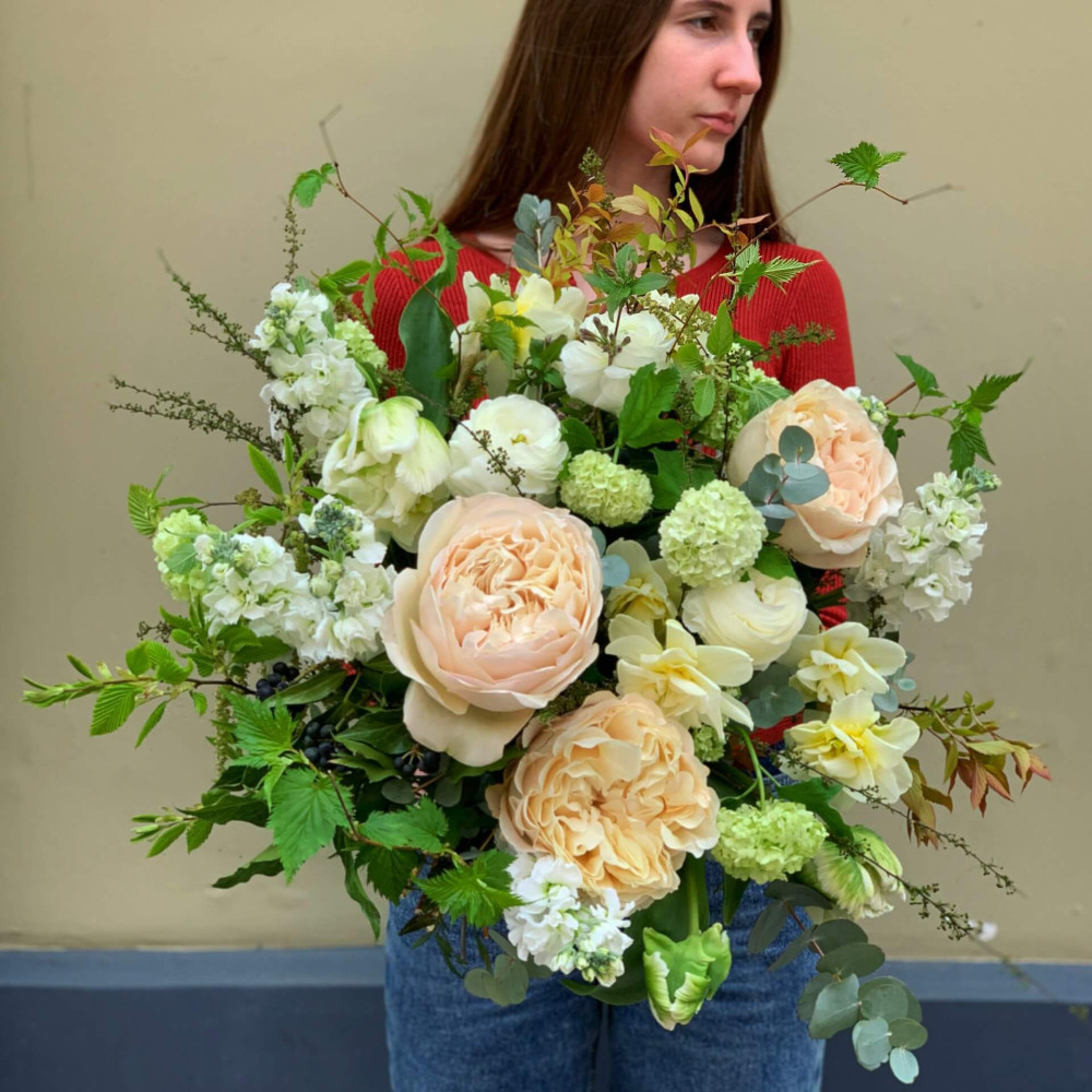 Цветы: Роза пионовидная, Маттиола, Ранунклюс, Нарцисс, Эвкалипт, Тюльпан, Вибурнум