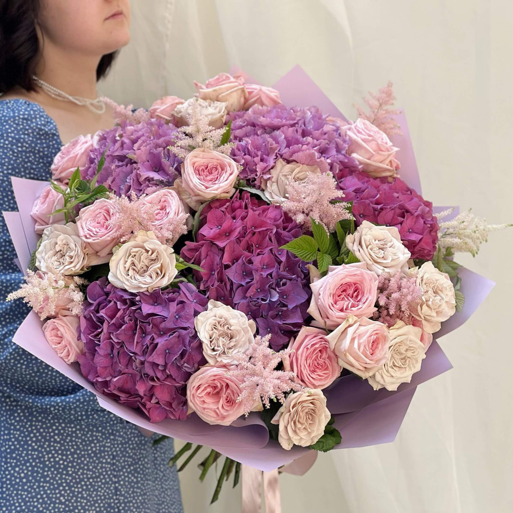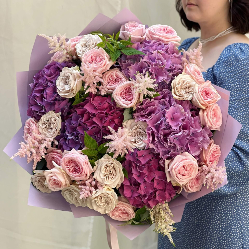 Цветы: Роза пионовидная, Гортензия, Астильба, Малина