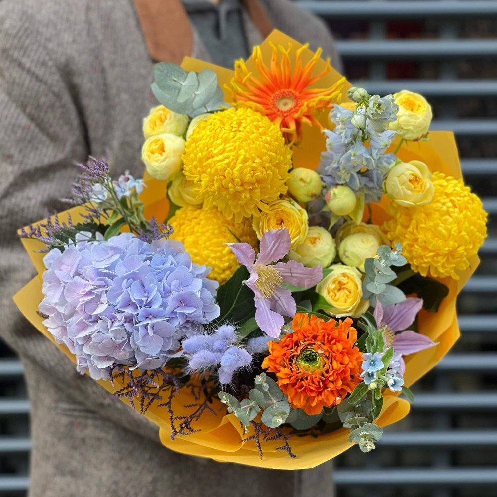 Цветы: Гортензия, Хризантема, Ранунклюс, Гербера, Роза кустовая, Клематис, Кермек, Оксипеталум, Эвкалипт
