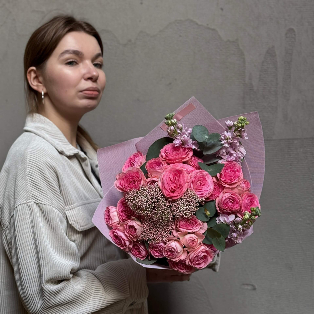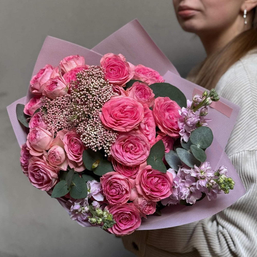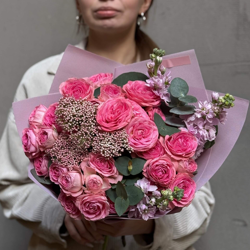 Цветы: Озотамнус, Роза пионовидная кустовая, Маттиола, Эвкалипт