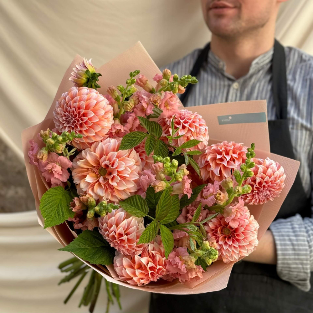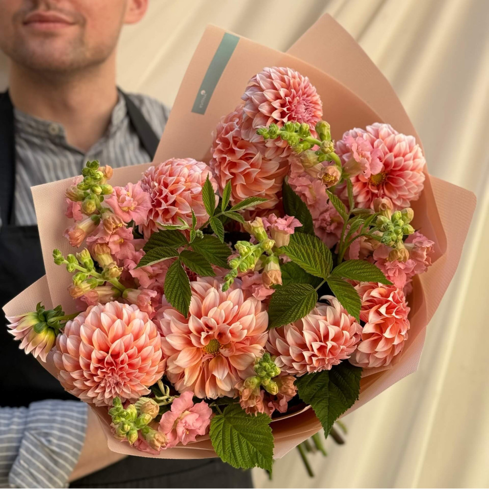 - Как заказать Букет с георгинами и антирринумом «Персиковое наслаждение»? ❯