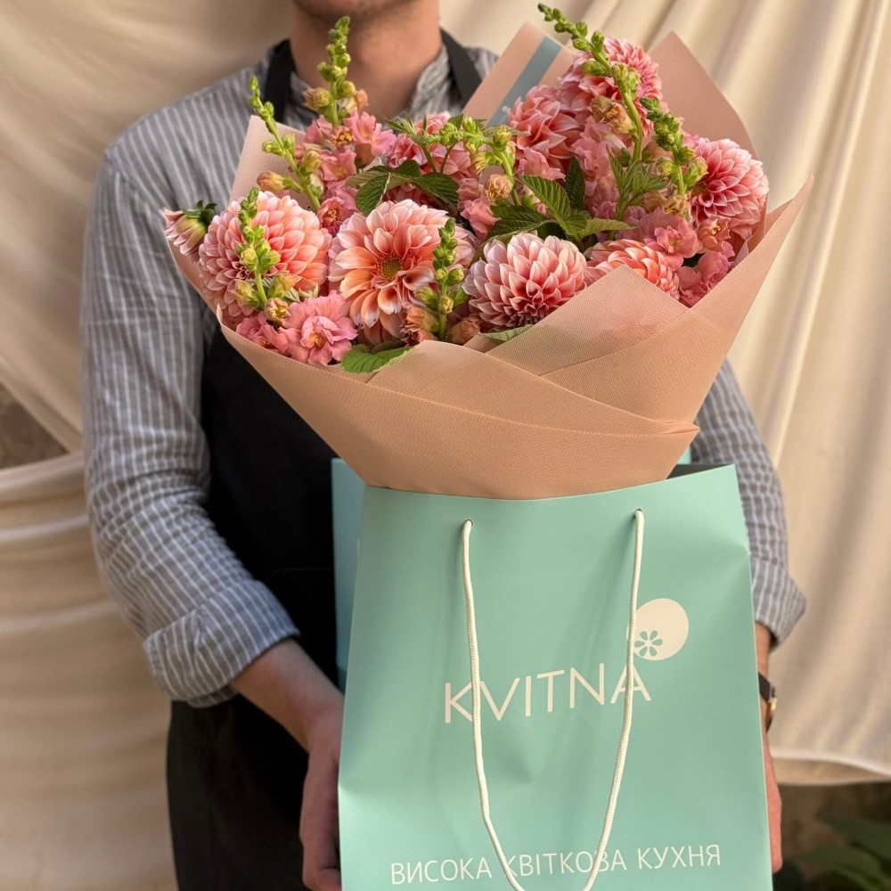 - Букеты от Kvitna доставляются в фирменной упаковке, которую нужно снять при установке цветов в вазу. Не срезайте ленту, связывающую букет, чтобы сохранить форму.