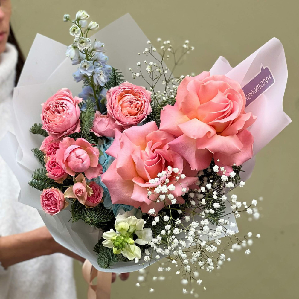 Цветы: Роза пионовидная, Гортензия, Дельфиниум, Гипсофила, Нобилис (ель), Антирринум, Роза