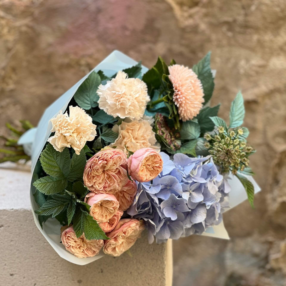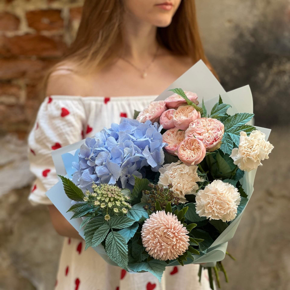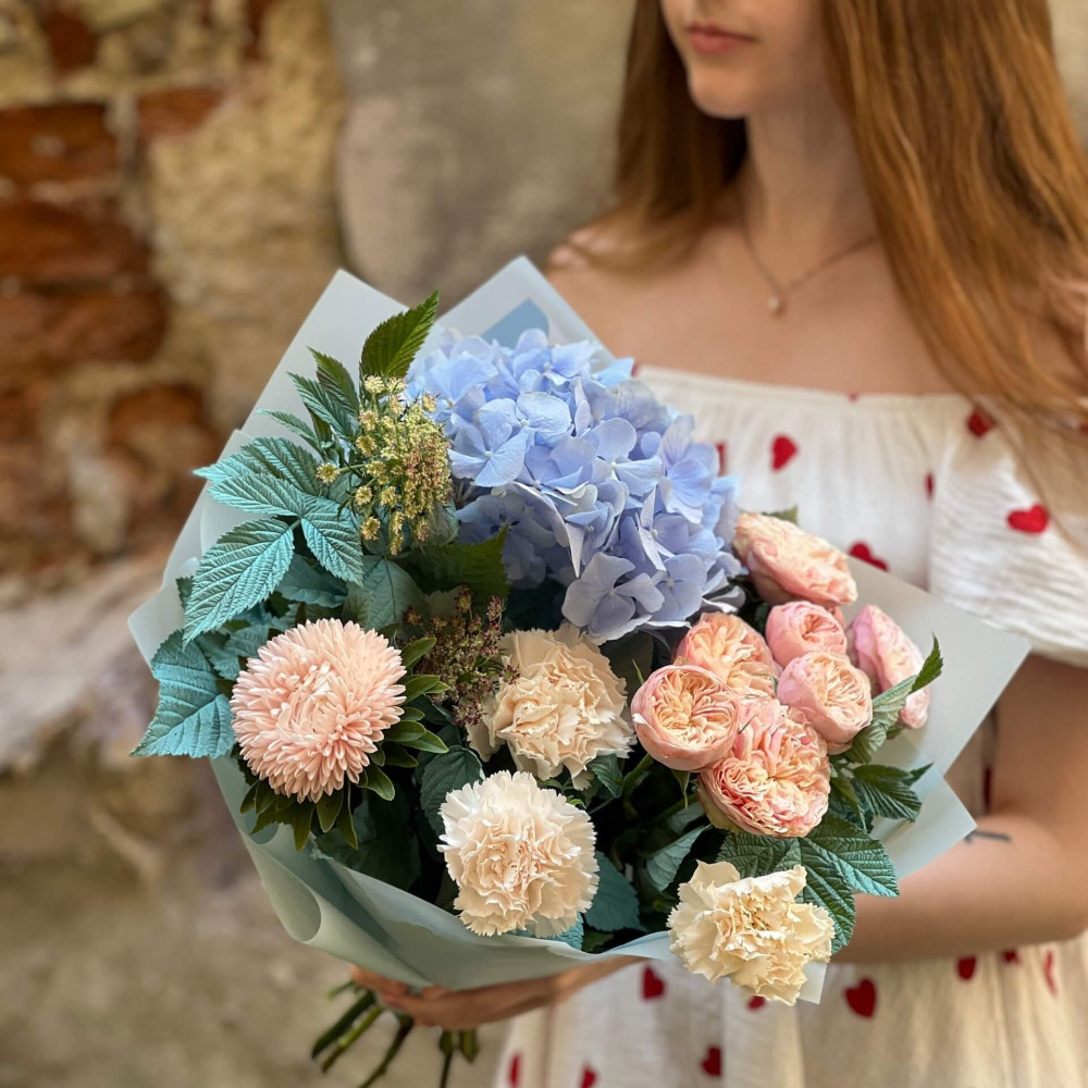 Цветы: Гортензия, Астра, Диантус (Гвоздика), Даукус, Роза пионовидная кустовая