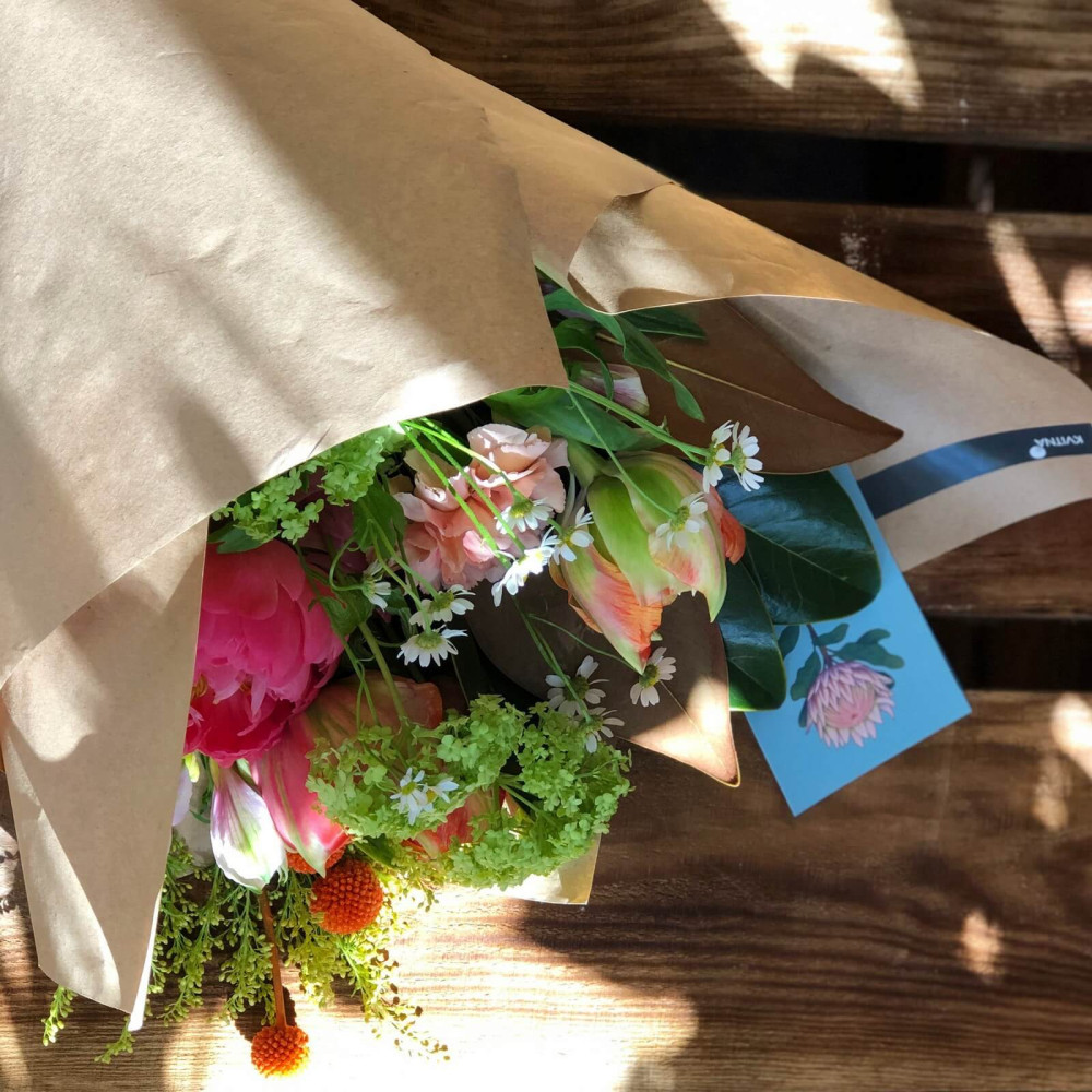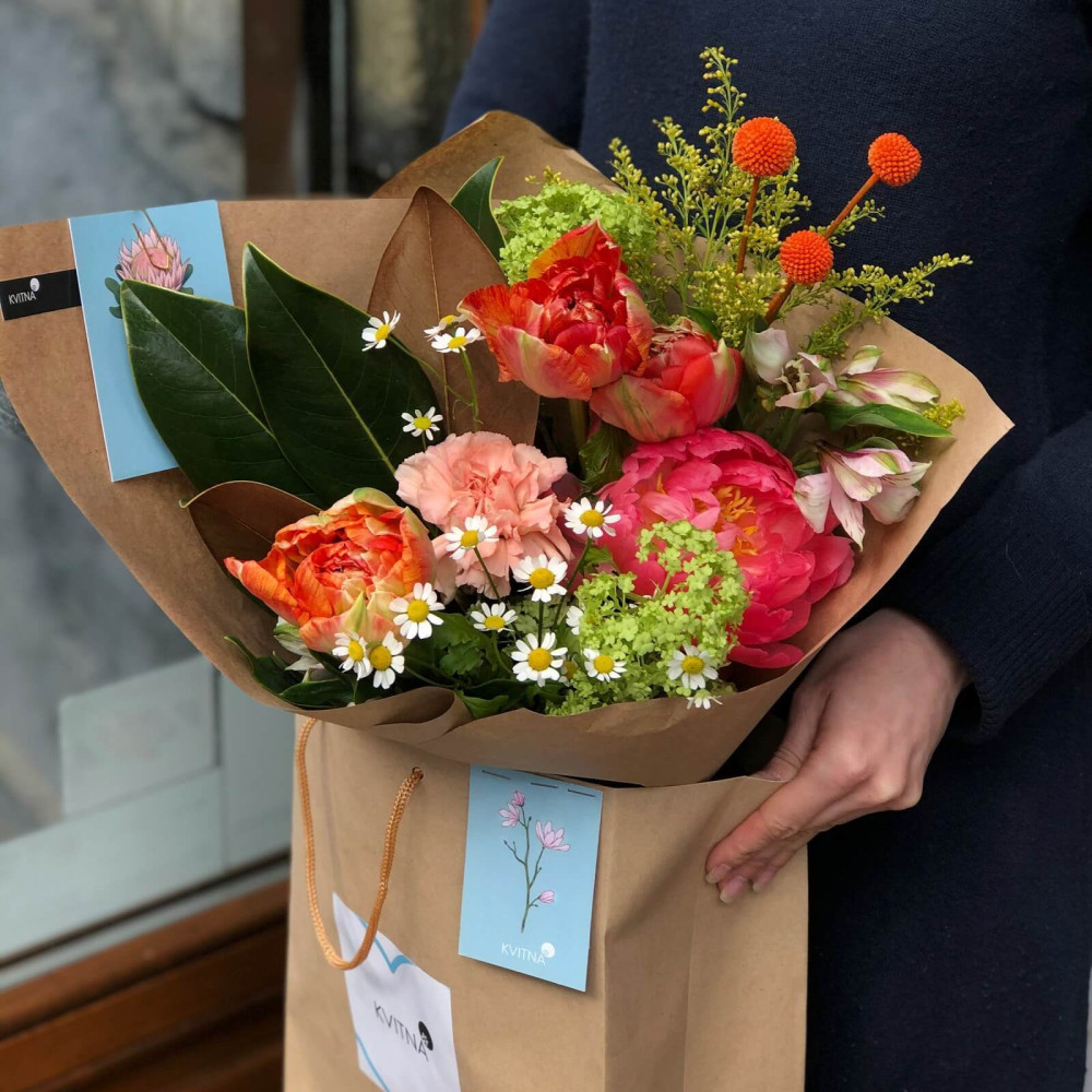 - Букеты от Kvitna доставляются в фирменной упаковке, которую нужно снять при установке цветов в вазу. Не срезайте ленту, связывающую букет, чтобы сохранить форму.