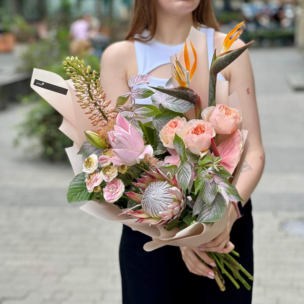 Цветы: Эремурус, Роза пионовидная кустовая, Лилия, Стрелиция, Протея, Малина (листья), Роза пионовидная