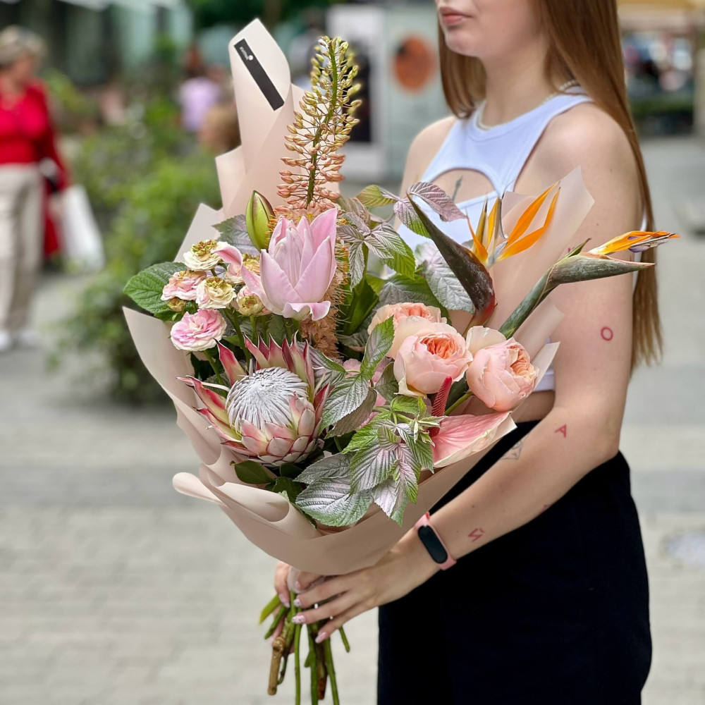 - Как заказать Экзотический букет с протеей и стрелицией «Пение в Джунглях»? ❯