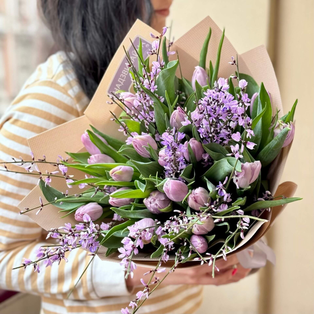- Как заказать Фиолетовый букет из тюльпанов и генисты «Весенний сиреневый»? ❯