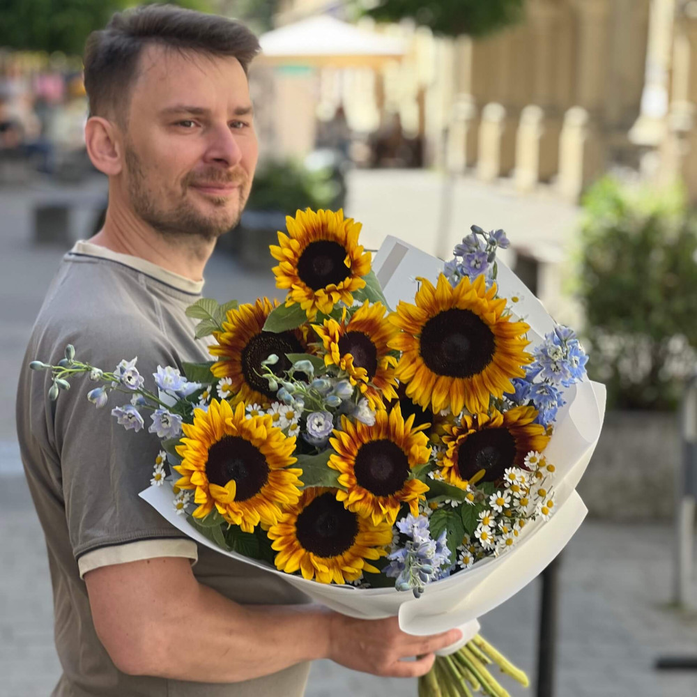 Летний букет из Подсолнухов, Дельфиниума и Танацетума. Собран в 2025 году флористом компании Kvitna — Оленой Шмагало. Бюджетный ценовой диапазон.