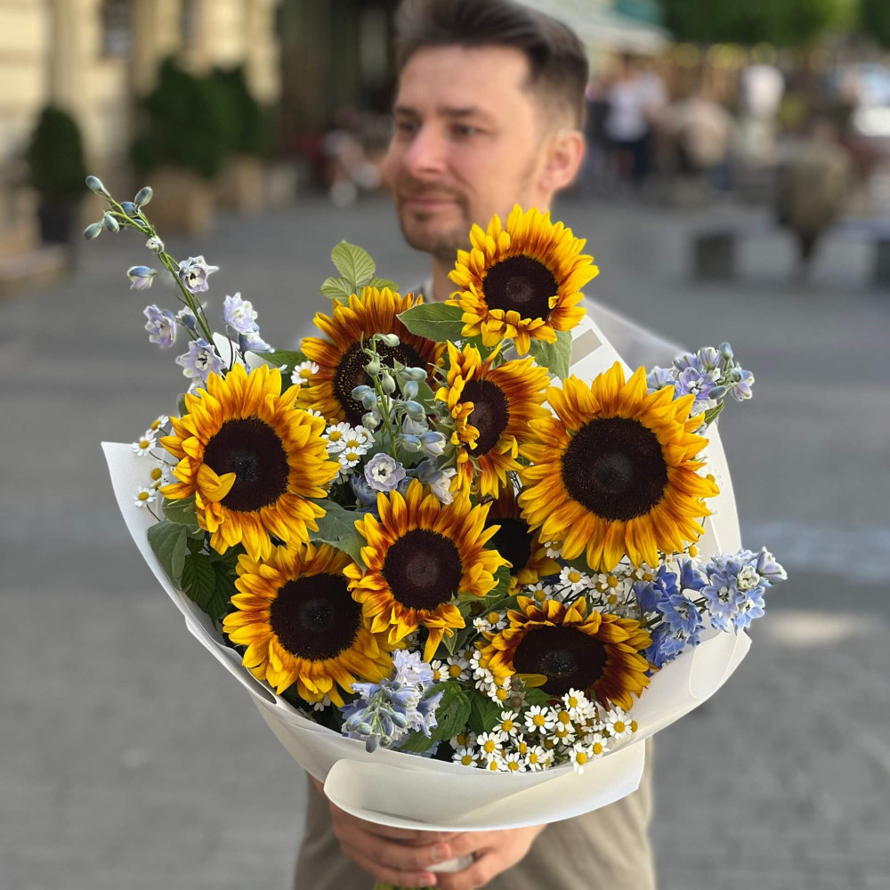 - Как заказать Яркий букет с подсолнухами «В объятиях неба»? ❯