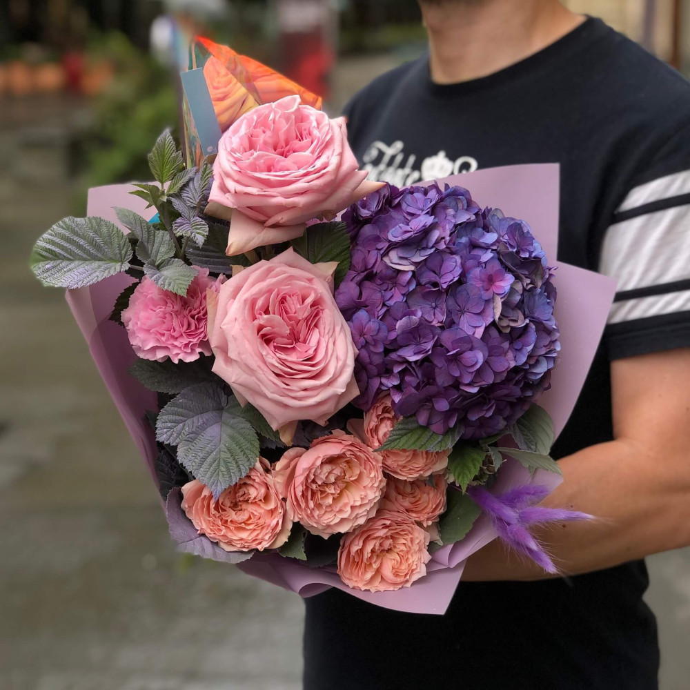 - Как заказать Контрастный букет с гортензией «Бархатная ночь»? ❯