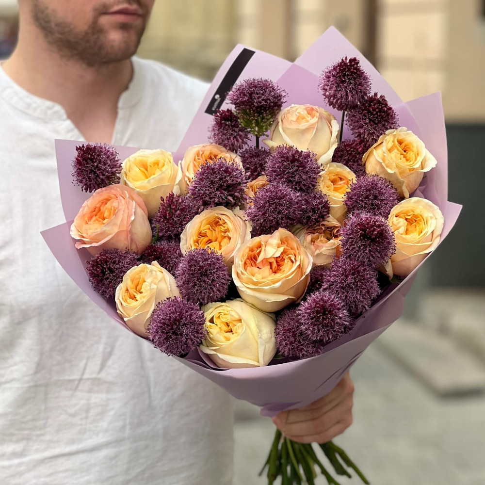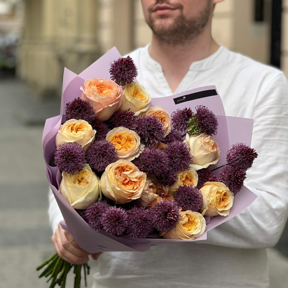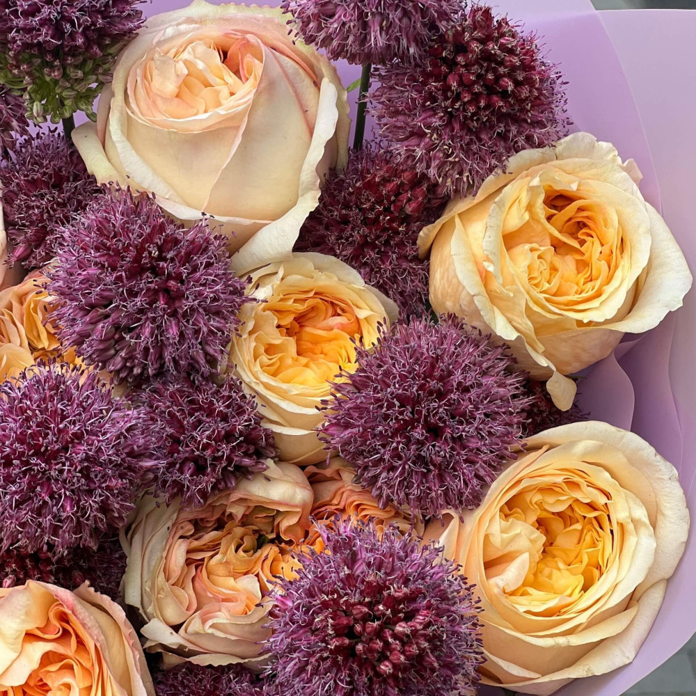 - Как заказать Контрастный букет с аллиумами «Ежевиковое пралине»? ❯
