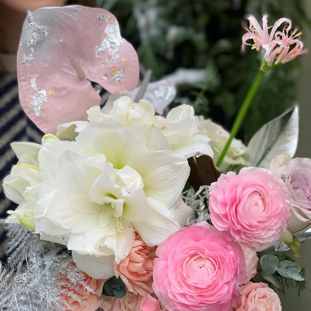 Цветы: Антуриум, Нерине, Роза, Гипеаструм, Диантус, Ранунклюс, Аспарагус, Роза кустовая