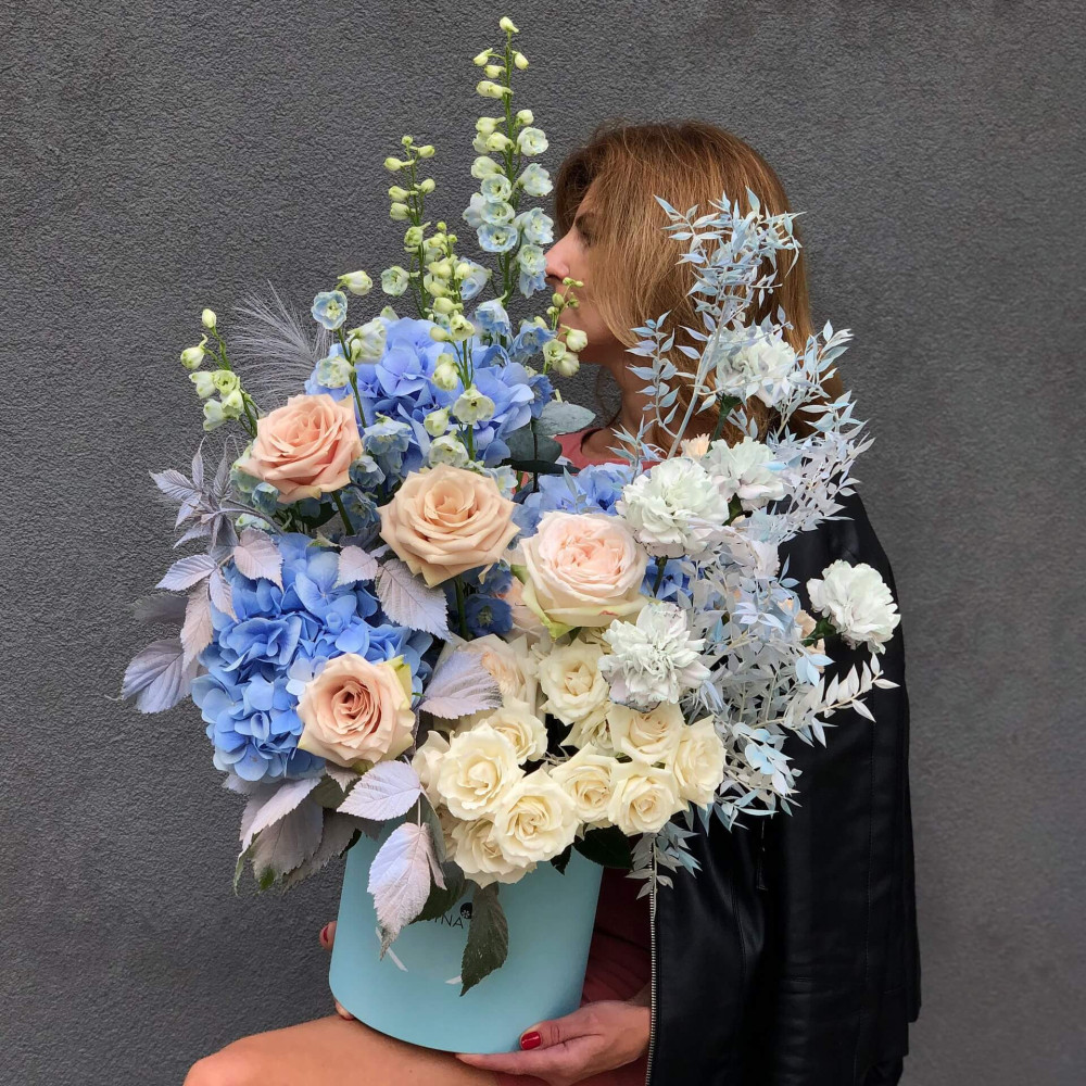 Цветы: Дельфиниум, Роза пионовидная, Роза кустовая, Диантус, Рускус, Гортензия