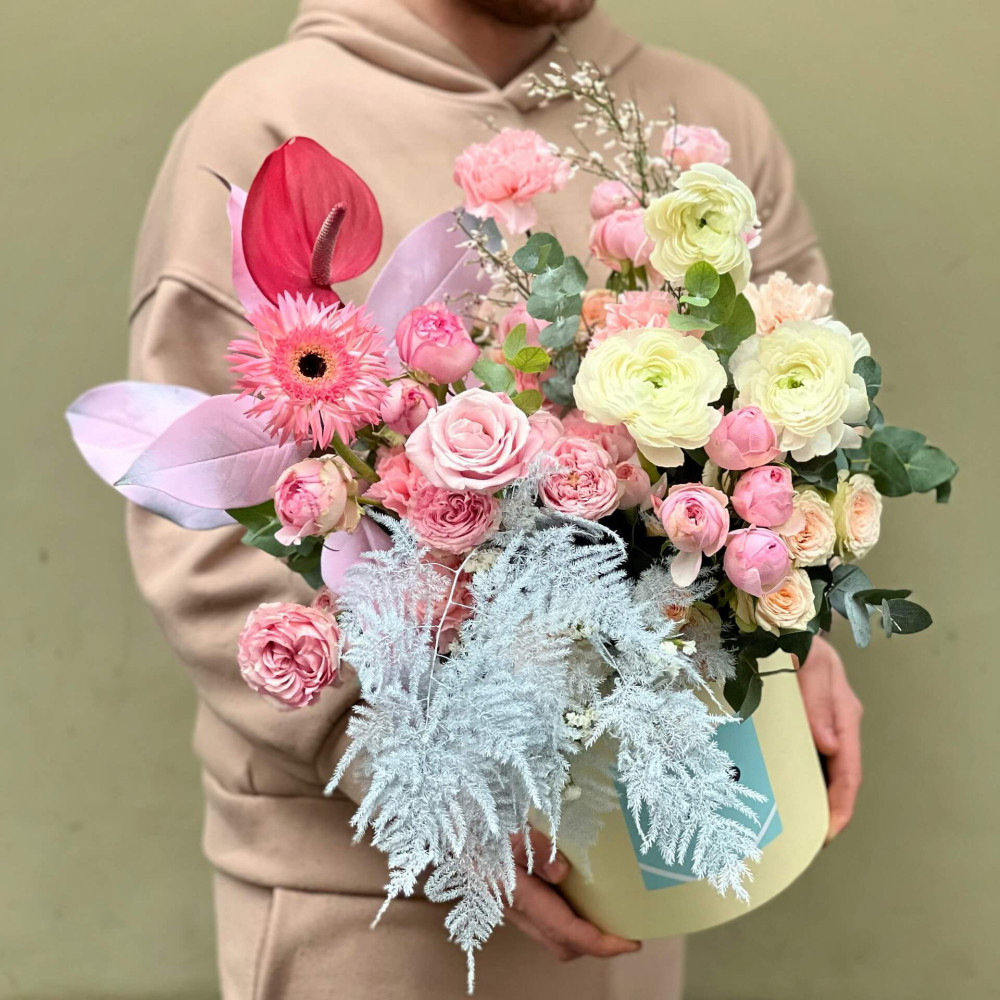 Цветы: Ранунклюс, Роза кустовая, Диантус, Аспарагус, Эвкалипт, Гербера, Антуриум, Гениста