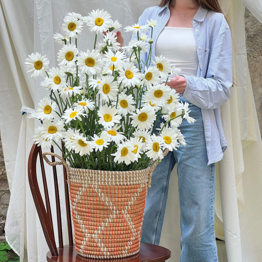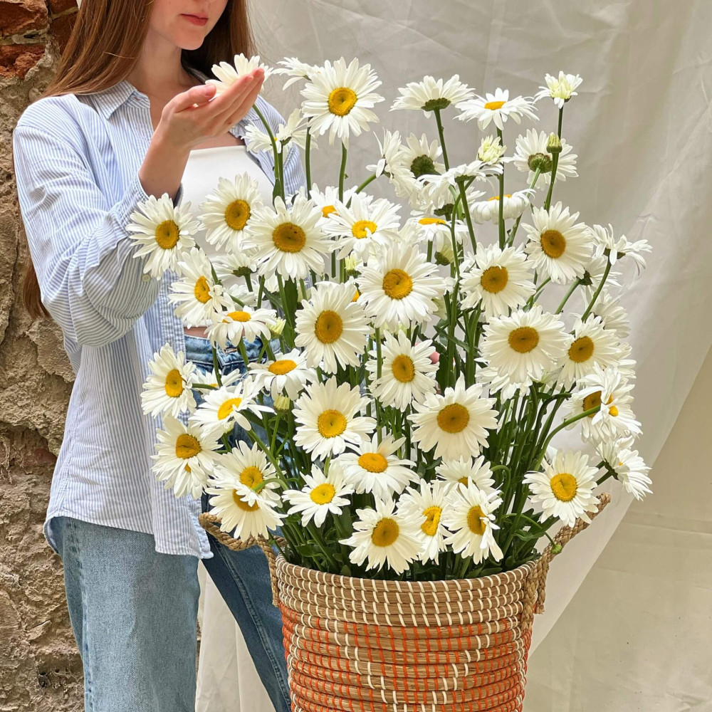 Из-за того, что мы используем только интересные, необычные, стильные сорта ромашек, которые заказываем на голландских аукционах - букеты ромашек доступны целый год. Однако лучше уточните наличие у нас перед оформлением заказа.